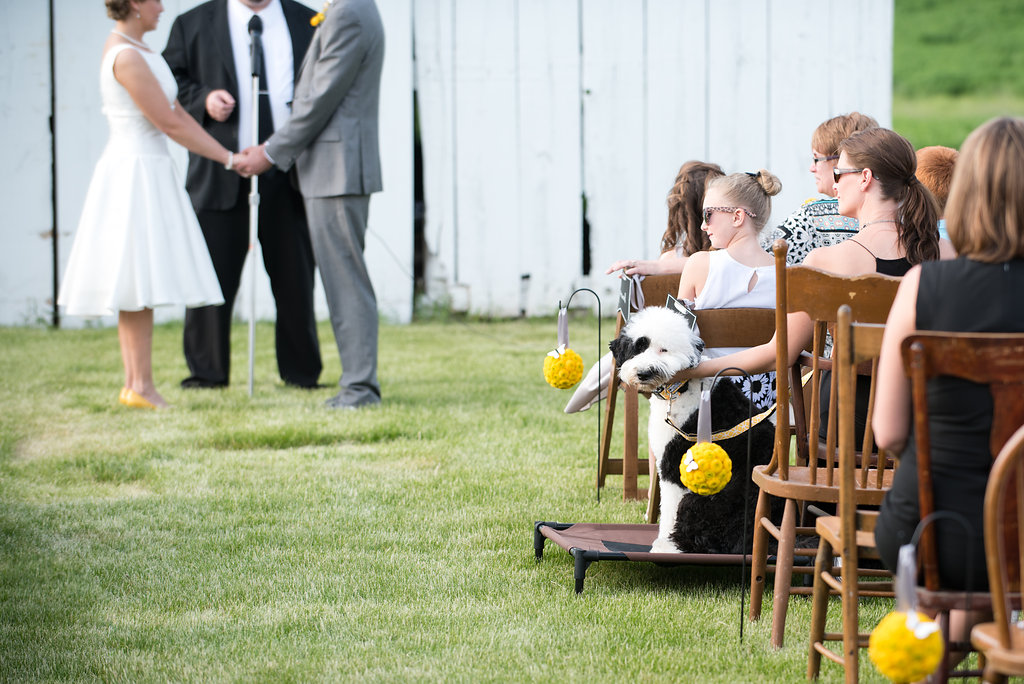 “We didn’t have groomsmen, but our ring bearer – Derby the Portuguese Water Dog – wore a custom collar with bow tie and matching leash, purchased on Etsy.