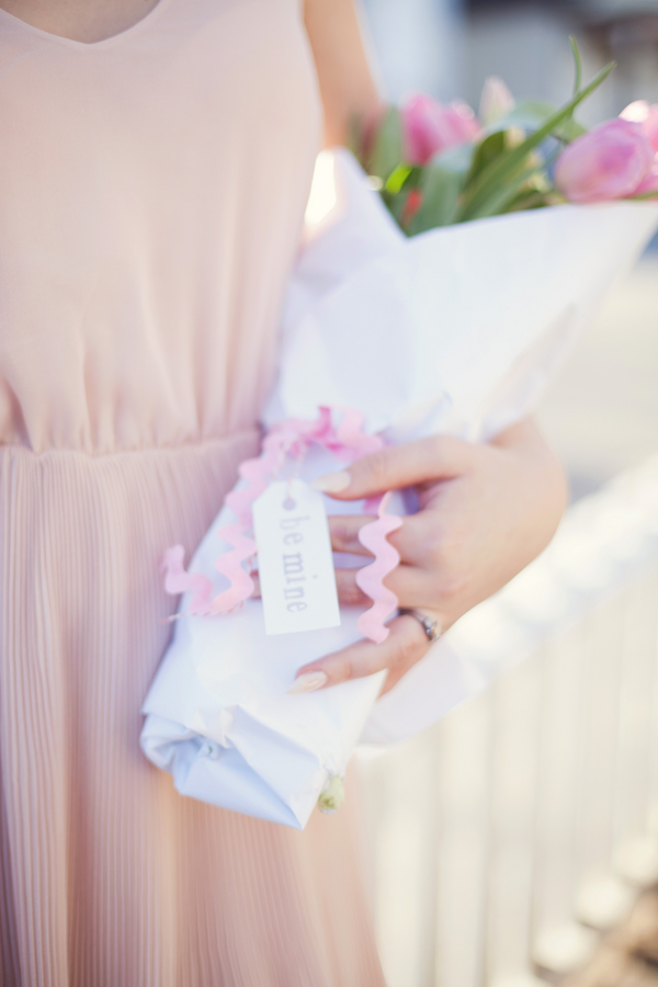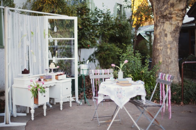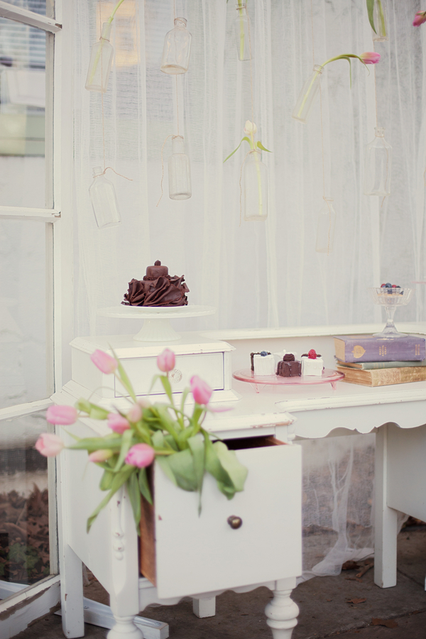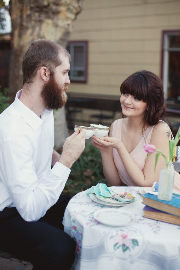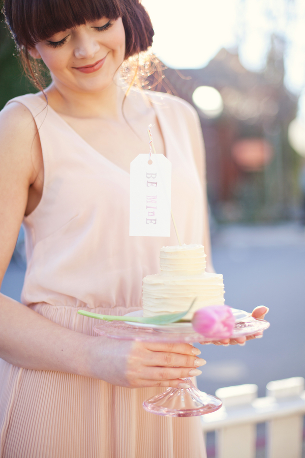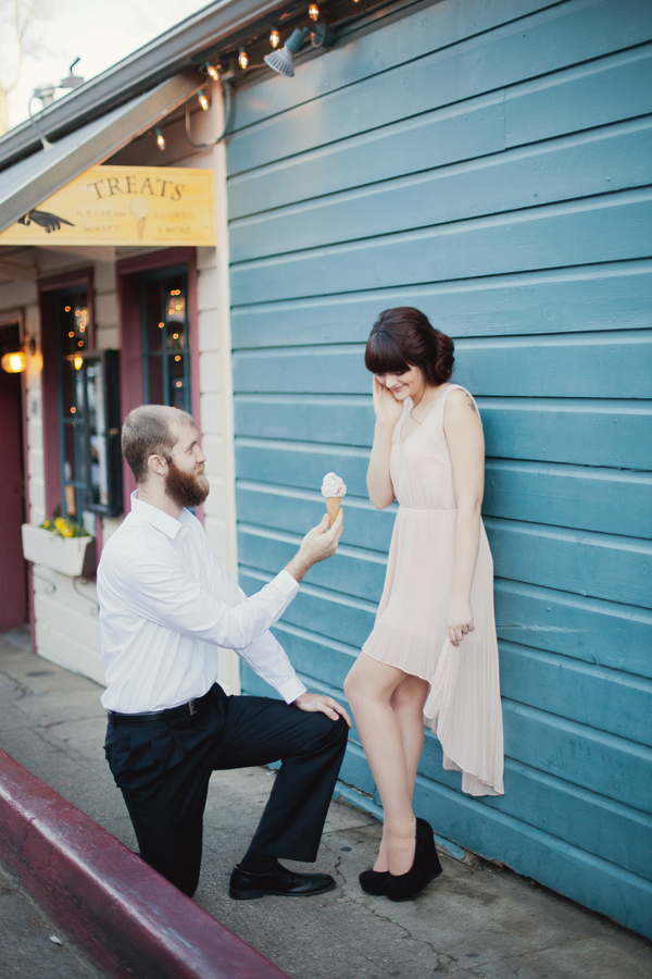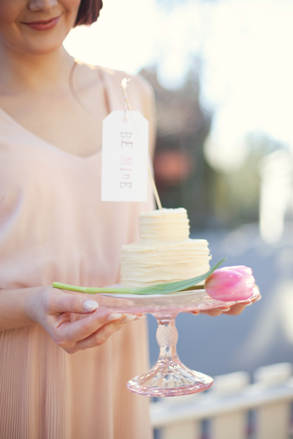 Our love affair with French themes continues with today’s Parisian inspired engagement shoot. No wonder – Valentine’s Day is tomorrow and amour is in the air! Keep reading or scroll down to see the pics for this perfect romantic styled engagement shoot that fits this weeks theme to a tee. Comments from the photographer: “When our team of vendors set out to create a styled shoot, we knew we wanted a super sweet and romantic theme, since Valentines Day is right around the corner. Originally, we planned on a shoot in the snow. However, with the California drought still in effect, most of the snow melted away quickly. A week before our scheduled shoot our team discussed our options: cancel the event, or create a brand new look in record time… we decided on the latter! “Fortunate for us, we live in an adorable town with elements of European influence in the architecture, so we played off of the beauty around us. Our baker, Felicia Yoder (who works for Broad Street Bistro in Nevada City), asked permission to use the cafe for our location, which was the perfect fit for our vision. We are also big fans of the local ice cream shoppe, Treats, which has an adorable aesthetic and lots of fun details, so we planned on using that location. “Erica Henderson (from Tin Roof Farmhouse rentals) pulled items from her collection that were feminine, soft, romantic and Parisian-inspired, including her own cafe table and chairs, china sets, cake platters, and vintage books. She then created a table scene and separate vignette backdrop, which included old door frames, and hanging vases with pink tulips. Together, the scene felt sweet and unique. “We are thrilled with the end result, and hope it gives couples everywhere some inspiration to create a romantic escape for a one-of-a-kind engagement session!” “For our model’s style, Angela Nunnink’s (of Hair and Makeup by Angela) created a delicate updo that was inspired by a French Twist. She applied makeup to look natural and girly, with soft pink blush and lips.” “The day of the shoot, I got an email from a local friend who owns a beautiful vintage car, called a Riley Elf. When she heard we were doing a styled shoot, she offered to use her car, but she only had a 10 minute window for us to shoot. I decided to go for it! We parked the car in front of Treats, and shot a sequence of photos that turned out to be my favorite part of day. It was meant to be, and tied in so perfectly with our theme!” Felicia Yoder (our baker) made a few different sweets that were equally beautiful as they were delicious! Her two “Tiny Cakes” were a hit; she decorated her chocolate cake to resemble rose petals layered around it’s base. The white cake was simple yet gorgeous– we added a tulip for a romantic touch, and a “Be Mine” tag to the top to complete the look. Felicia also made fruit tarts, and petite fours for a perfect French touch.Gallery