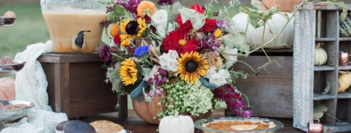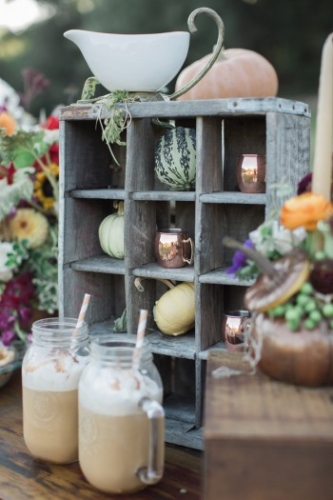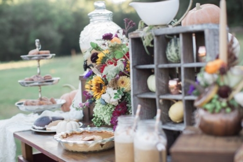 We love all the unique decor and scrumptious baked goods. Pumpkin pie, apple cider donuts, and chocolate filled donuts sit neatly among wood and vintage details. One thing I like about table scape is how easy it is to replicate. Paint a few pumpkins in white or toned colors, find an old wooden crate (or have a handy man build you a miniature curio cabinet), and fill a pumpkin or gourd with a beautiful flower arrangement. Simple!