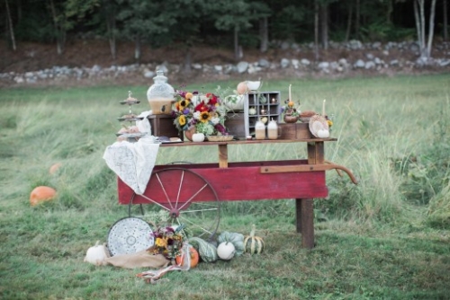 I just adore that cute miniature copper mug that fits in well with this outdoor pumpkin theme. Copper seems to be all the rage for weddings this year and fits right into a fall theme with orange and yellow color tones.