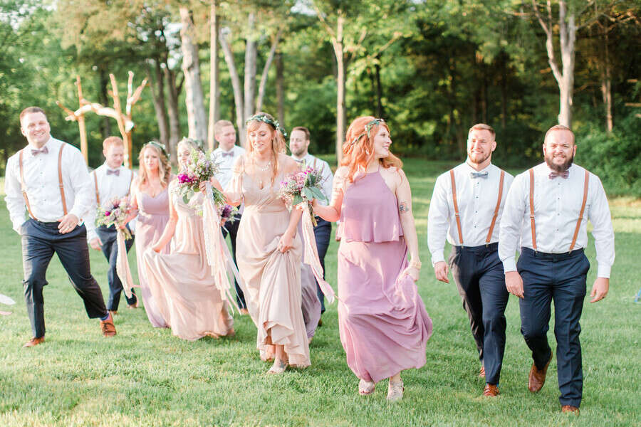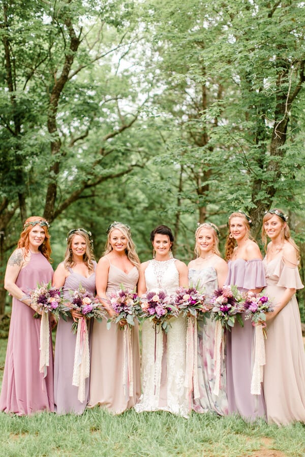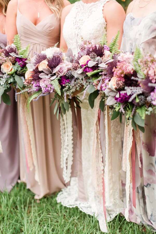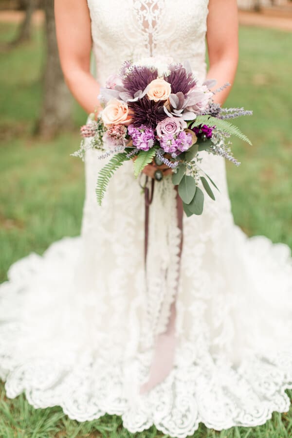 Q1: Tell us about your wedding! “Our wedding day inspiration originated from my love for the macrame pieces crated by my MOH. The macrame fit perfect with a bohemian theme and soft mauve/purple color palette. Intricate details included my heirloom diamond passed down from my husband’s great grandmother, as well as her dishes. “There were also memory photo charms eloquently suspended from my bouquet. During the ceremony we incorporated the wine box unity, where we placed personalized letters to each other to be read on our first anniversary.” Q2: Let’s talk wedding decor “Our wedding decor was centered around the handmade macrame, however, we also used a variety of antique dishes, brass candlesticks, velvet, and lace to compete the table centerpieces. “We hung DIY embroidery hoops on tree limbs to give the entrance to the ceremony site a charming ambiance. The outdoor photo booth was accented by draping garlands of Saree fabric to draw the eye of our guests.” Q3: What were the florals like in your wedding? “A combination of real and artificial purple and mauve flowers were used for the bridal and bridesmaids’ bouquets. “Our florist suspended ribbons of different colors, textures, and sizes from the bouquets. The colors brought all the girls dresses together beautifully! “The ceremony backdrop, photo booth setup, and tables were adorned with greenery while ferns of all shapes and sizes were placed along the aisle, in the bouquets and boutonnières, and around the ceremony site to enhance our boho vibe. The wedding florals tied everything together perfectly!” Q4: Did you personalize the day in any way?” “Our wedding day had many special moments. A close family friend sang as I made my way down the aisle and another good friend provided live music entertainment in between the wedding and reception. We are definitely lucky to have such musically inclined people in our lives! “My favorite part of the wedding day was when the rain finally stopped and the sun appeared through the clouds to give us the perfect backdrop for our ceremony and pictures as husband and wife. The rain that preceded the ceremony made the grass and trees lush, green, and gorgeous!” Q5: Let’s talk fashion “I wore a fitted, high neck dress with intricate ivory lace details. “My husband was in a two toned ensemble with a velvet bow tie and pocket square to match his best man’s tie. “Each bridesmaid wore a slightly different color and style dress with jewelry that complimented the neckline of each. To bring forth more boho style, they wore a green leaf flower crown with half up braided hairstyle. “The groomsmen outfits included matching white shirts and blue pants with brown leather suspenders, dusty purple bow ties and personalized wooden cufflinks.” Q6: How did you meet? “My husband and I are high school sweethearts. We started dating when I was a freshman and he was a junior. 10 years down the road, he finally proposed! “The proposal was romantic as it was just him and I in our home. He proposed to me on his grandparent’s anniversary with an heirloom diamond that belonged to his great grandmother.” Q7: What was the most anticipated or special moment of your wedding day? “Everything about our wedding was special to me. One specific moment that I anticipated was when my husband and I locked eyes as my two older brothers walked me down the aisle to him. Another special moment was when we said our vows. I became very emotional as I said mine, causing lots of tears at the ceremony!” Q8: Do you have any wedding planning or marriage advice that you’d like to share with other couples planning their day? “To anyone planning their wedding, make sure you have a backup plan for rain! I never imagined that it would rain on my wedding day. And even though the weather said it wasn’t suppose to, it did. “The most important advice I can give you is –invest in a good photographer! A photographer can make or break your day. Ours was amazing, not only at photography and making getting pictures fun, but with keeping everything on time and being there for encouragement and advice.”Gallery