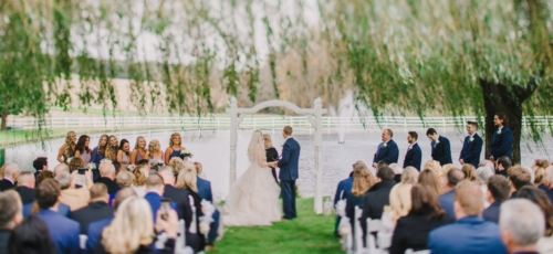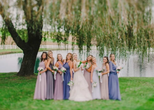 Photographer’s Comments: “Everyone’s approach to planning their wedding is a little different based on so many factors. Your history and interests as a couple as well as input from family and friends can be such a strong influence in directing how you plan your day! “Take all that and then imagine planning your wedding from many states away – this is what Raechal and Gordon maneuvered through in the early stages of their wedding planning. “Despite those challenges, Rae and Gordon’s Pond View Farm Wedding was absolutely lovely. They fell in love with Pond View Farm’s willow trees by the water and beautiful barn reception space which fit their rustic and bohemian wedding theme with white floral accents (put together with love by Raechal’s mother). I especially loved how well the different bridesmaid dress styles worked together and popped against the beautiful green grass and willow tree branches! “Looking back, one of the funniest moments happened right before Raechal and Gordon’s first look. We positioned Gordon beneath the willow tree while he waited to see Rae in her wedding gown for the first time. As she approached, another special guest decided to join in the moment – the farm’s cat! Rae laughed as she bent down to pet the kitten before proceeding with the first look. Not too long after that, Rae + Gordon’s pup also joined in for portraits and he was the cutest! “Although it was chilly, the rain that had been forecasted was kind enough to delay its approach long enough for Rae + Gordon to make it official and get the party started! We even had a few moments to sneak out for some fun night portraits since the cloud cover didn’t give us a regular sunset to work with. It was truly a lovely day full of laughter, photobombing kittens, family, and friends!”About This Wedding