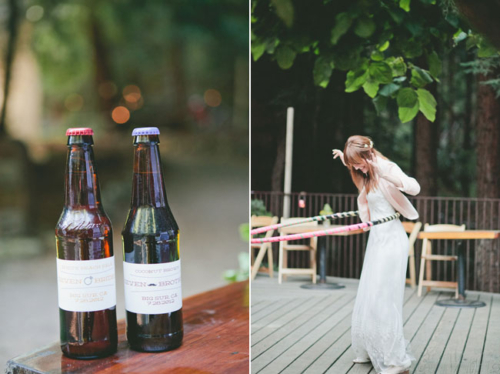 “A few of our friends have taken up brewing their own beers, even selling them at local bars. We often go to their house and taste the latest creation and are always pleased, so we were thrilled when they told us their gift would be home brewed beers for the reception. They brewed His and Hers beers with flavors that matched our personal tastes (coconut brown and white peach!). They surprised us by naming and labeling the beers with names that payed homage to the fact that we met while performing as dance partners in the show Seven Brides for Seven Brothers.”