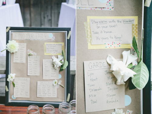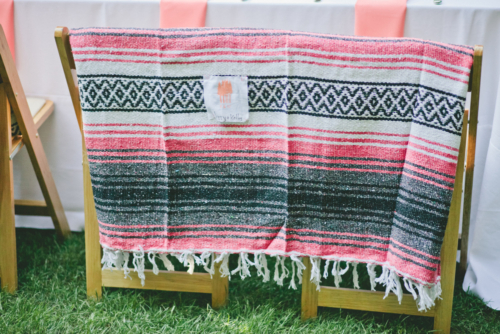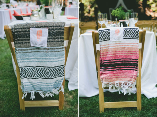 “We used mexican-style blankets with guest’s names stamped on them as our place cards. The blankets doubled as our favors and also helped keep guests warm once the sun went down.”