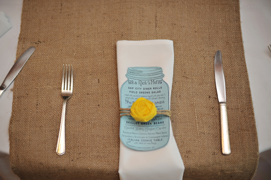 Blue and yellow wedding details, and some birds! That is what I noticed first when I saw Rich and Gia’s amazing wedding pictures. From yellow shoes and flowers to blue bottles and DIY napkins, this wedding from Ohio is special!
