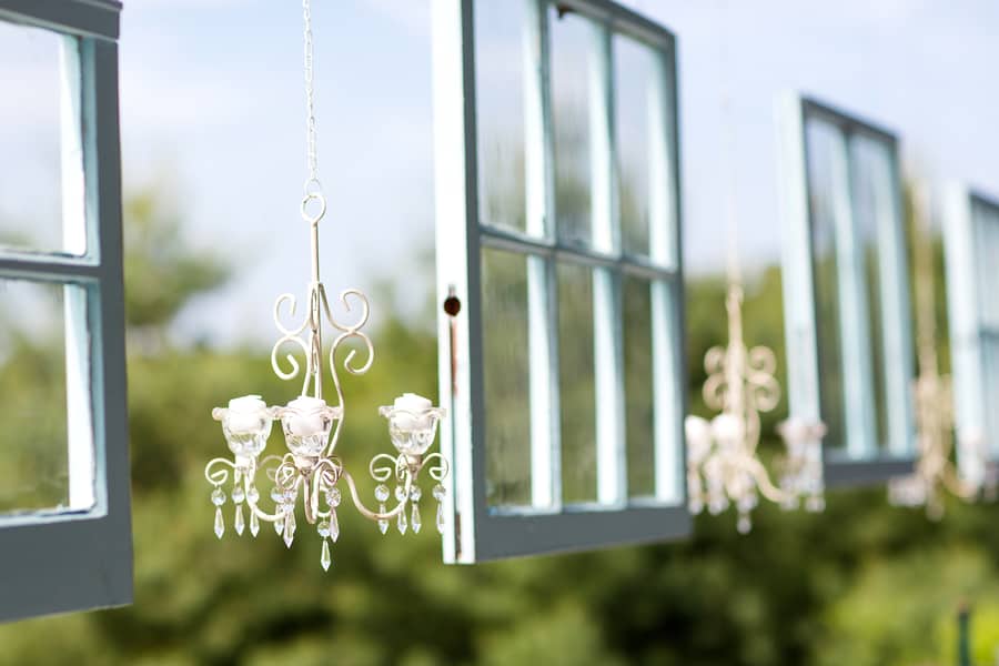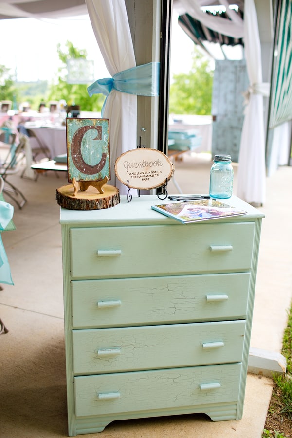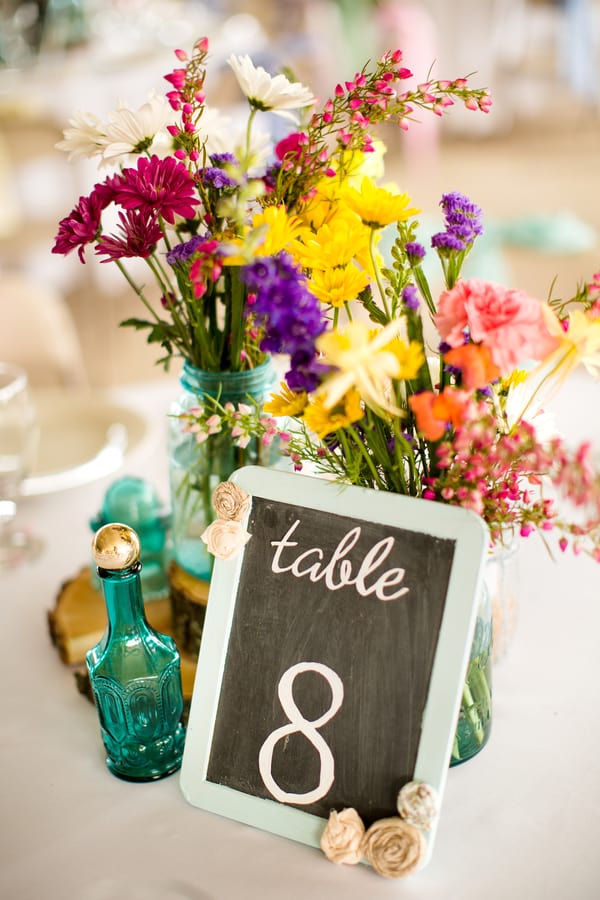 • The hanging window panes, the chalkboard table numbers, and favors are all a unique touch.
