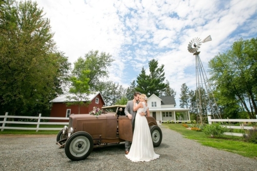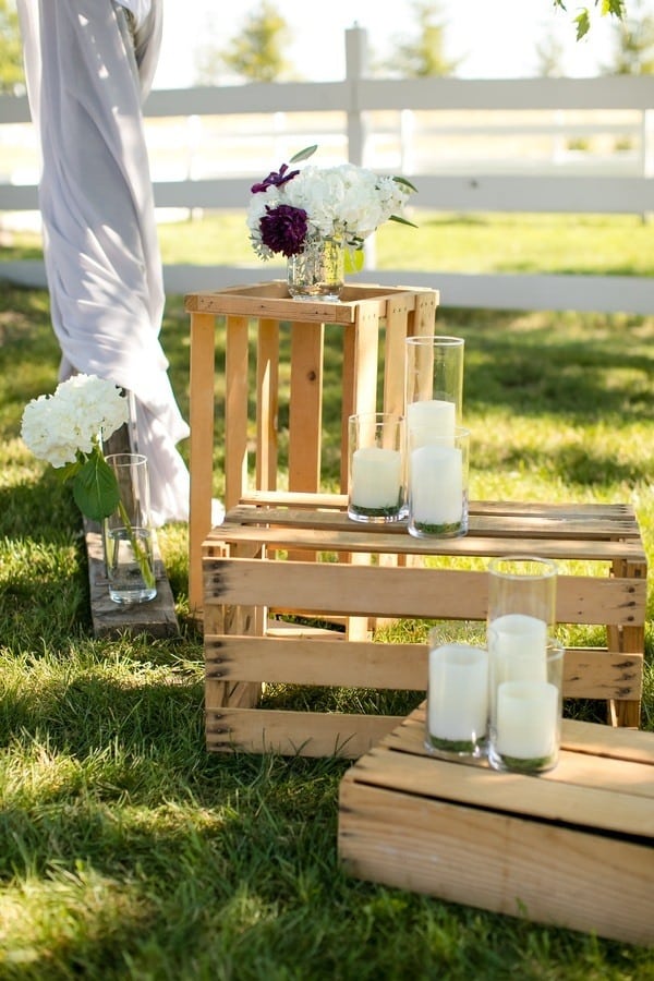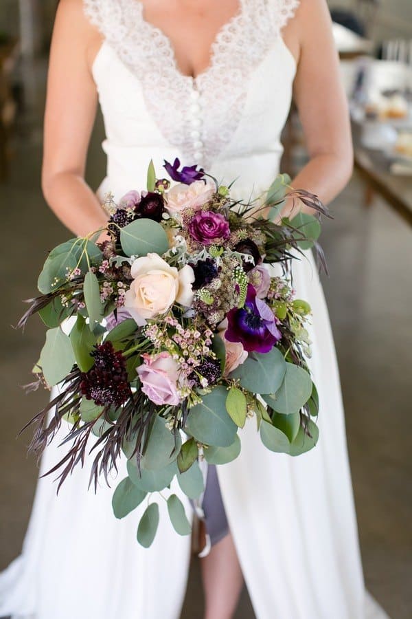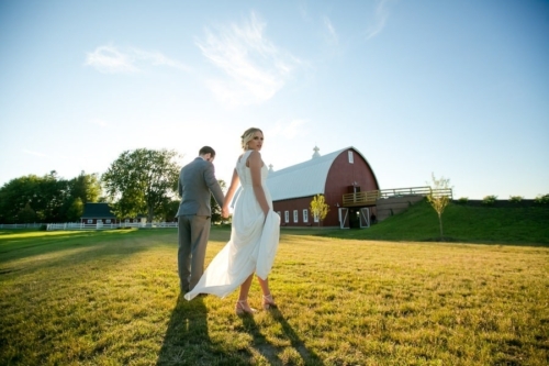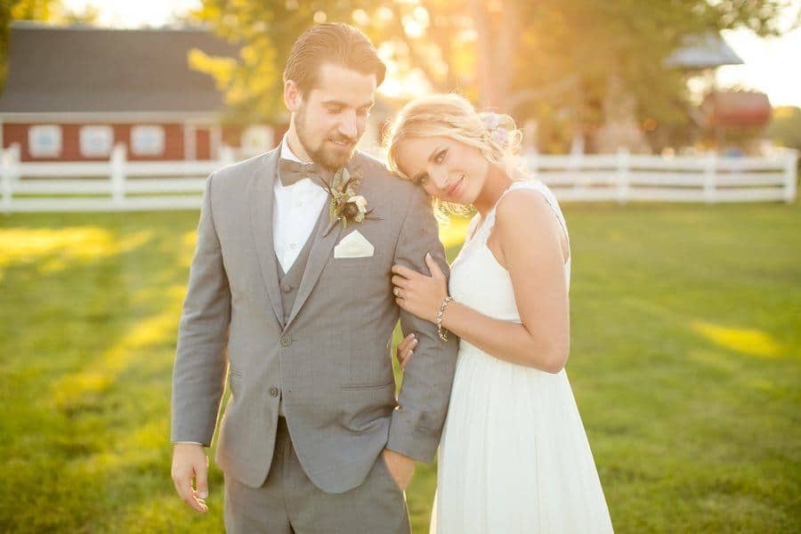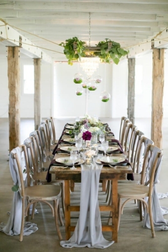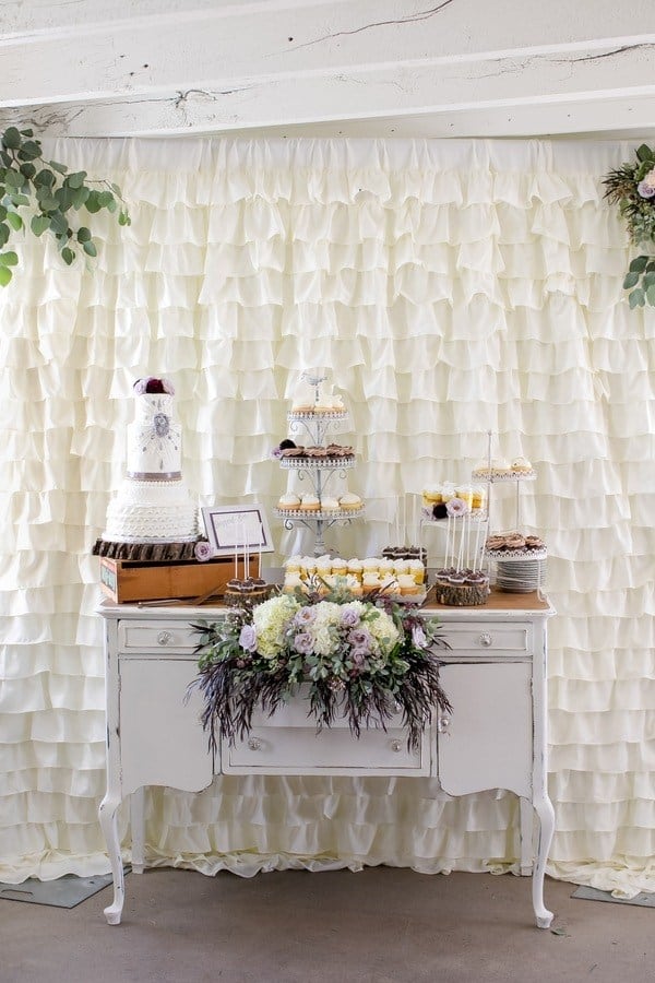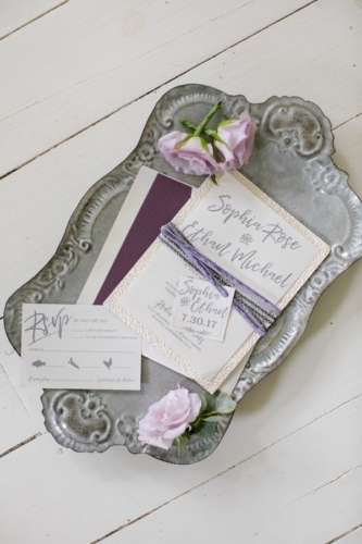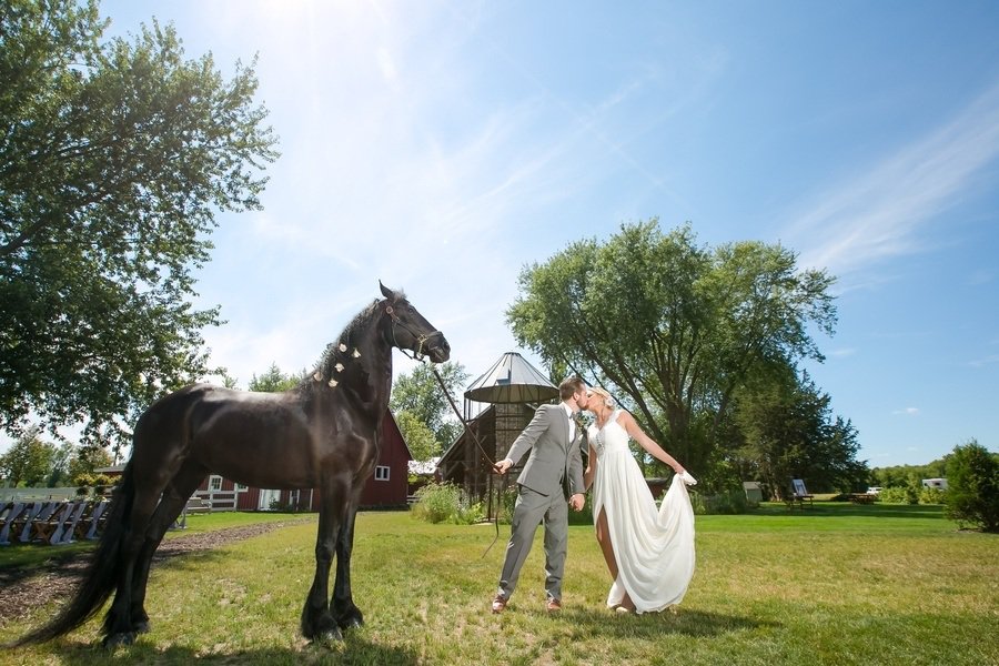 Photographer’s Remarks: “Redeemed Farm is a historic century-old farmstead in . This new Minnesota farm wedding venue was listed as one of the Venue Report’s most stunning barns across the USA in 2017. “This styled shoot was inspired by the farm’s rustic charm and beautiful fields. Couples will be inspired by these up and coming trends with this royal purple, soft lavender, deep burgundy, and blush color scheme. Our bride and groom models are a real couple that got married three weeks after this styled shoot! “Their authentic smiles and interactions showcase the fun of a farm wedding. The Redeemed Farm’s bridal suite is a Scandinavian cottage with white exposed wood and an upper loft area with skylights. “To beat the summer heat on the farm, our bride is wearing a flowy A-line Leanne Marshall gown with a high slit and our groom is wearing a light gray suit. For couples that love animals, why not let the farm residents in on the fun? “Our bride and groom had the farm’s 17 hand black beauty join in for a few portraits to truly capture the farm’s essence. Couples tying the knot on a farm will also be inspired by these popular farm ceremony options: outside or under the barn rafters. “Our outdoor ceremony site is decorated with rustic crates, candles, and flowers. The wood arch is adorned with draping and hanging glass ball vases enclosed with fresh blooms and greenery. “Our indoor ceremony site includes cascading drapery lusciously spilling from the top of the barn rafters, complimented with a chandelier, lanterns, flowers, vases, and log cuts. “Our summer harvest table for the newlyweds and their wedding party showcases the use of different shades of purple, greenery, and draping to create a stunning focus for the reception. Above the table is a vintage ladder wrapped with greenery with hanging glass balls containing roses and greenery. “A vintage buffet hutch with a ruffled backdrop, rustic log rounds, tiered stands, and florals displays a tiered cake, cupcakes, and cake pops. After some cake, a wedding favor that every guest will love is a gooey custom s’more from a s’mores bar.