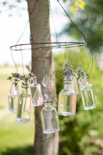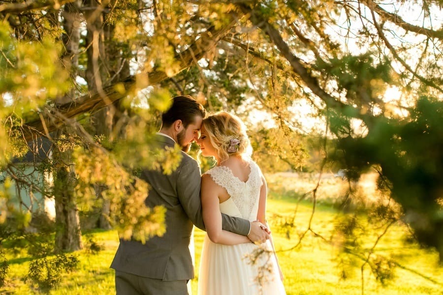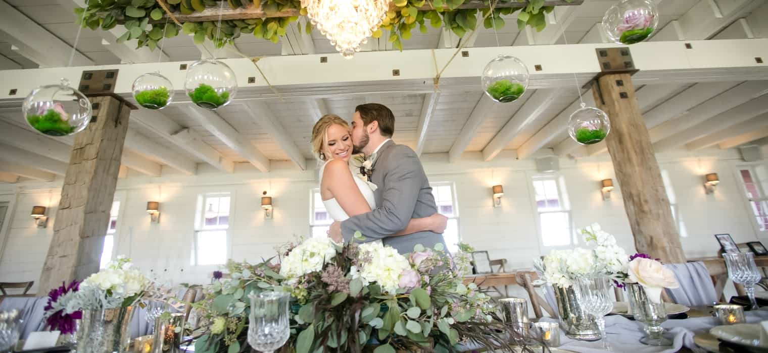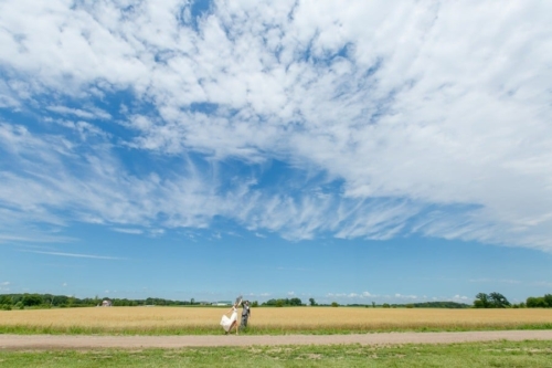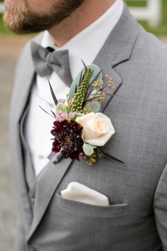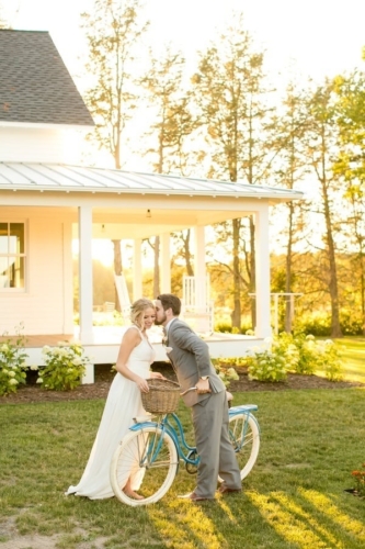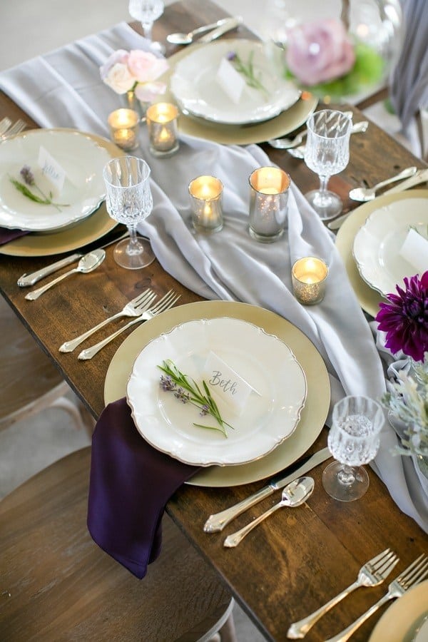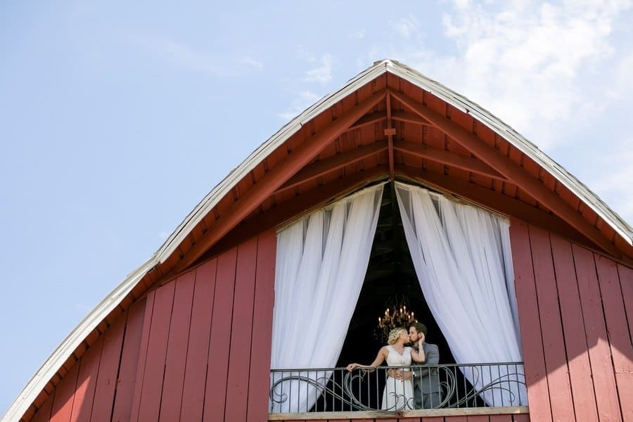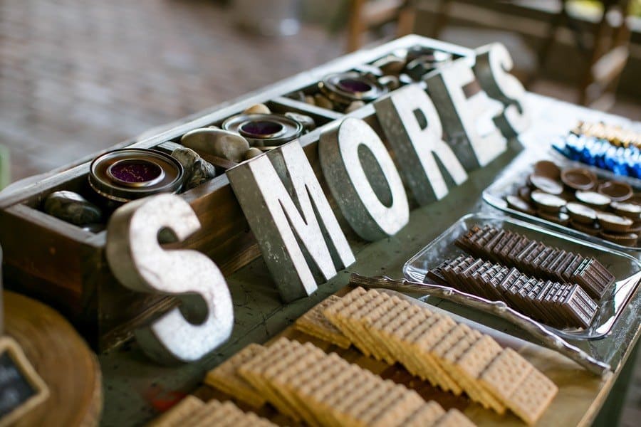 Photographer’s Remarks: “Redeemed Farm is a historic century-old farmstead in . This new Minnesota farm wedding venue was listed as one of the Venue Report’s most stunning barns across the USA in 2017. “This styled shoot was inspired by the farm’s rustic charm and beautiful fields. Couples will be inspired by these up and coming trends with this royal purple, soft lavender, deep burgundy, and blush color scheme. Our bride and groom models are a real couple that got married three weeks after this styled shoot! “Their authentic smiles and interactions showcase the fun of a farm wedding. The Redeemed Farm’s bridal suite is a Scandinavian cottage with white exposed wood and an upper loft area with skylights. “To beat the summer heat on the farm, our bride is wearing a flowy A-line Leanne Marshall gown with a high slit and our groom is wearing a light gray suit. For couples that love animals, why not let the farm residents in on the fun? “Our bride and groom had the farm’s 17 hand black beauty join in for a few portraits to truly capture the farm’s essence. Couples tying the knot on a farm will also be inspired by these popular farm ceremony options: outside or under the barn rafters. “Our outdoor ceremony site is decorated with rustic crates, candles, and flowers. The wood arch is adorned with draping and hanging glass ball vases enclosed with fresh blooms and greenery. “Our indoor ceremony site includes cascading drapery lusciously spilling from the top of the barn rafters, complimented with a chandelier, lanterns, flowers, vases, and log cuts. “Our summer harvest table for the newlyweds and their wedding party showcases the use of different shades of purple, greenery, and draping to create a stunning focus for the reception. Above the table is a vintage ladder wrapped with greenery with hanging glass balls containing roses and greenery. “A vintage buffet hutch with a ruffled backdrop, rustic log rounds, tiered stands, and florals displays a tiered cake, cupcakes, and cake pops. After some cake, a wedding favor that every guest will love is a gooey custom s’more from a s’mores bar.