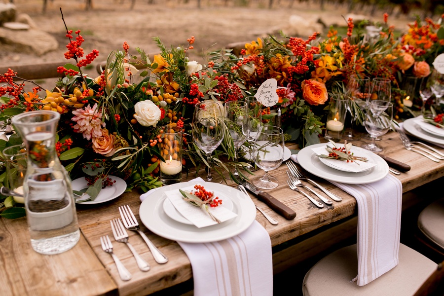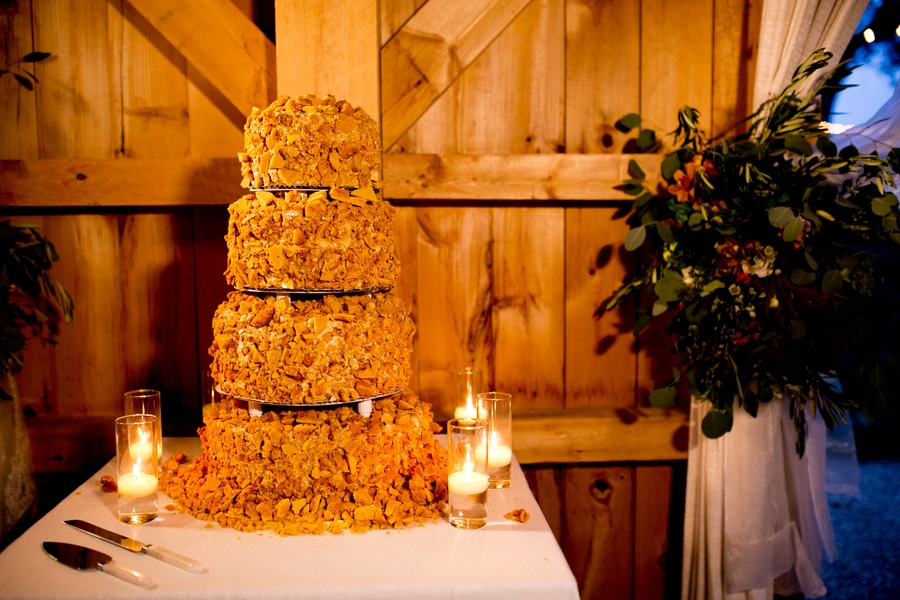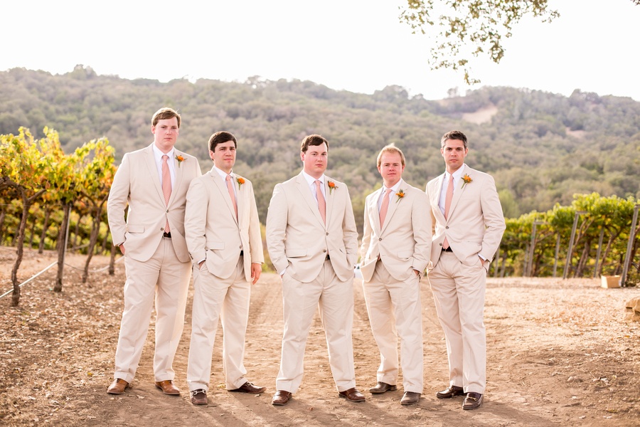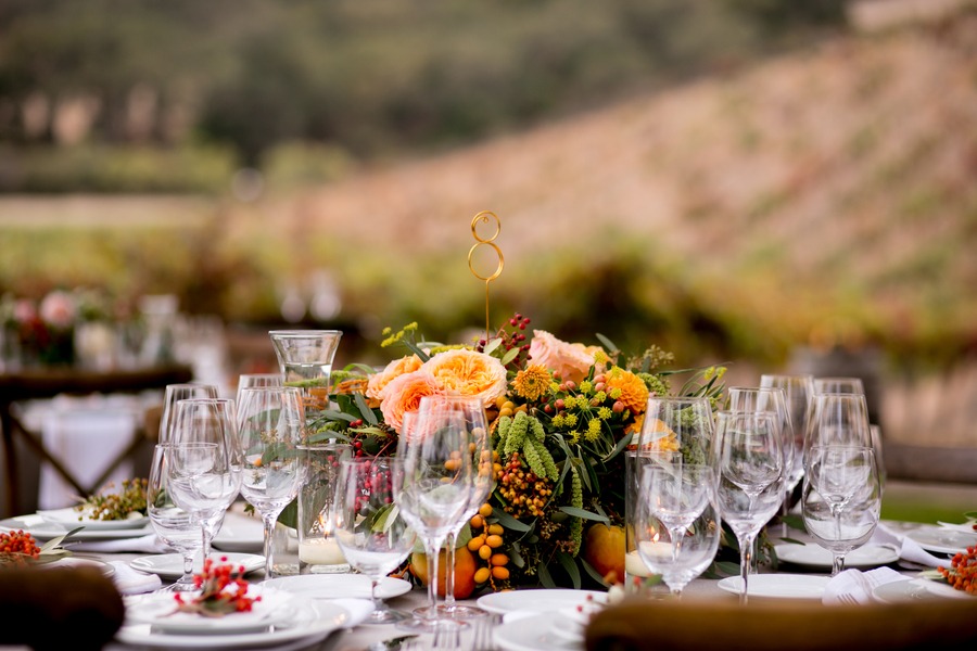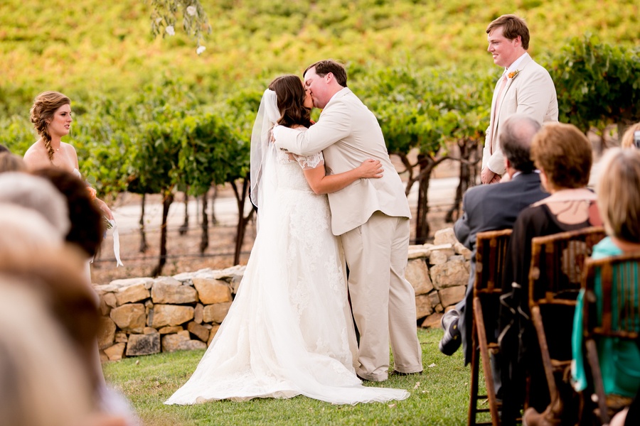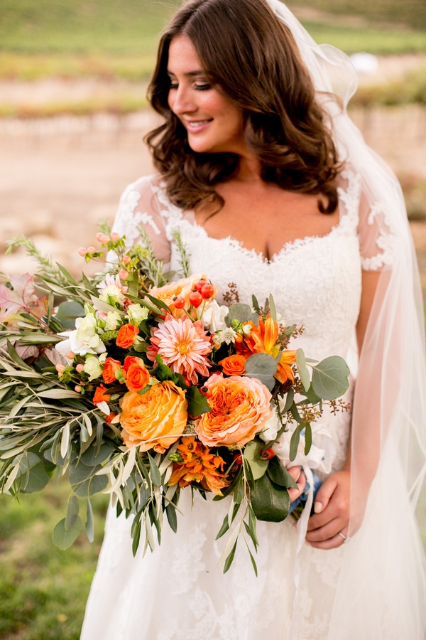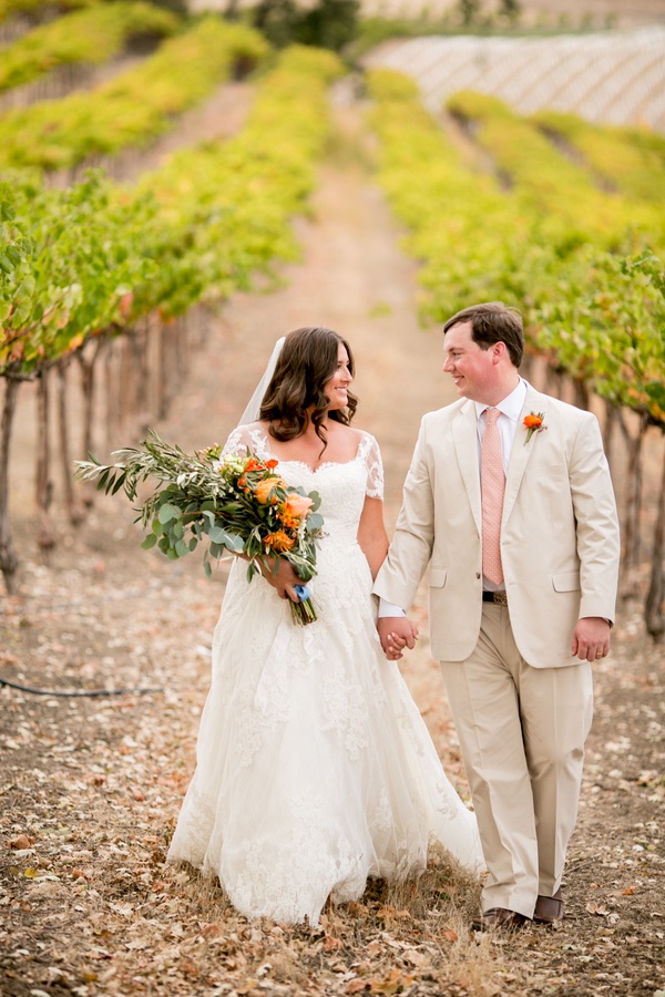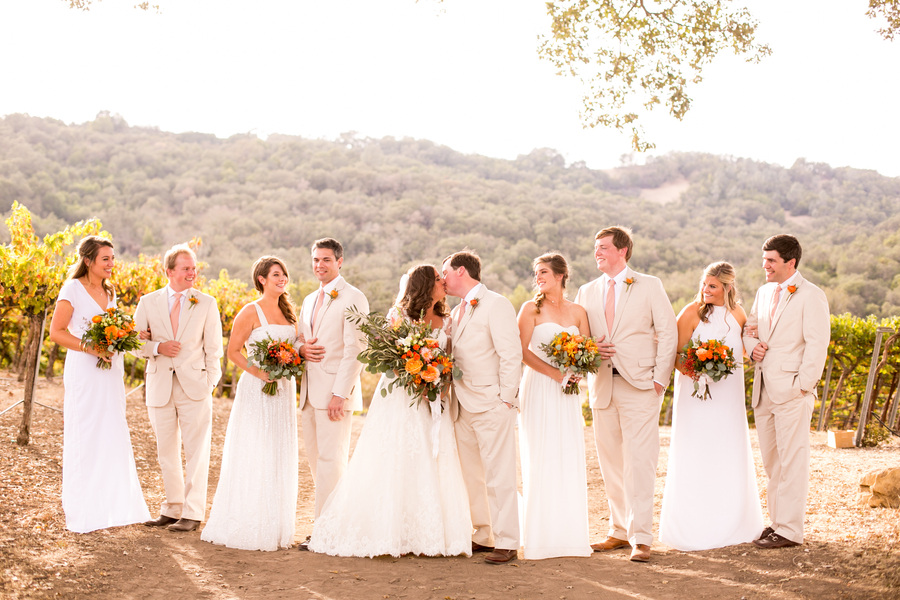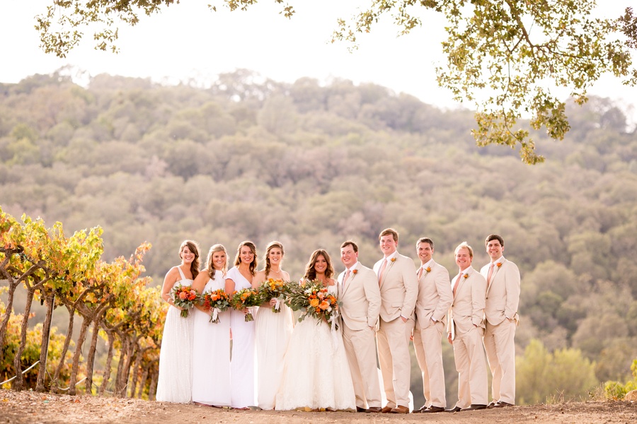 - Q. Tell us about your flowers, favors, cake, etc. A. My flowers were all different shades of harvest orange, my favorite accent color. I am really into neutrals and warm colors. We knew we needed some warmth and color because all of the bridal party was to wear white. My florist, Garden District from Memphis, is also a friend of our family and beyond talented. My inspiration was a kumquat, and I kept the rest of it really loose. I wanted Greg at Garden District to feel inspired by the vineyard and the beautiful flowers out there. I gave him total artistic license so the flowers were kind of a surprise to us and I loved that! Such a great surprise! I couldn’t have been happier with them, just like I knew I would be!