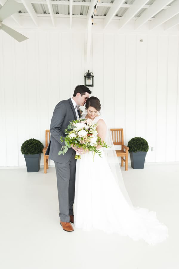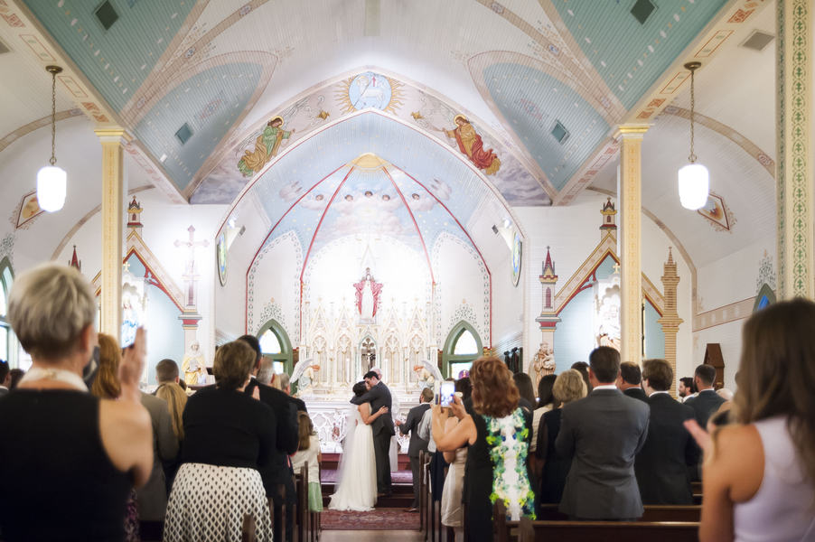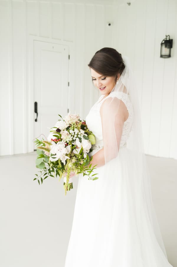 Describe your wedding invitations Made by Saint Merry Paper and Print My invitations were simple and sweet. I wanted a very romantic feel with script font and pastel flowers that were whimsical and very similar to my bouquet and other florals that decorated my wedding. RSVPs were done online on our knot website and included with the invite was a hand drawn map showing the church and reception venue. Describe the wedding dress Many friends recommended Whittington Bridal as the place to find my perfect dress. With a large selection and comfortable pricing, it was the perfect place. I tried on several dresses, but knew I wanted lace on top with some type of netting, and a flowwy bottom. I was able to find just that! It really was the dress of my dreams. Dress Designer: Lis Simon Shoe Designer: Antonio Melani Veil Designer: Beautiful U Bridal Veil & Accessories Jewelry Designer: Givenchy Groom Attire: Men’s Warehouse What was your vision for the wedding? I really didn’t have a strict color scheme for my wedding, but wanted to keep it pretty neutral. Besides some small pops of pink, dark maroon, and lots of greenery, most of my flowers were soft pinks, cream and white. I wanted a whimsical and romantic feeling throughout my wedding, but also wanted contrast with different textures such as metal, concrete, and geometric shapes. Overall, I wanted it to be simple because the backdrop of the pristine, white farmhouse made everything pop. Color palette Light greens, dusty pinks, creams Where was the wedding ceremony? St. Mary Catholic Church in Plantersville, a registered Texas Historic Landmark. This church is a beautiful painted german church built in the 1894 (web original building built in 1894, destroyed by a fire and current building built in 1917). Besides being extremely beautiful with its intricate details, it was important for Zac and I to receive the sacrament of marriage in the catholic church, before God and our families. In doing so, we were able to have my uncle (who was also my sponsor when I was confirmed in the catholic church) officiate our wedding. What types of flowers were used throughout the wedding? Blushing Bride, peonies, quicksand roses, bunny tail, hypericum berries, scabies flowers, hanging amaranths, queen annes lace, thistle, curly willow, eucalyptus leaves Bridal bouquet: Blushing Bride, peonies, quicksand roses, bunny tail, hypericum berries, scabies flowers, hanging amaranths, queen annes lace, thistle, curly willow Bout: blushing bride, scabiosa flower, bunny tail and globe thistle Ceremony: Nothing but the beautiful painted walls of the church! Reception Greenery on back wall behind cake table, with small flowers here and there sage colored table clothes with cappuccino napkins Centerpieces Mixture of silver geometric glass terrariums, grey concrete, and metal holders with small floral arrangements Describe the ceremony We were able to have my uncle (who was also my sponsor when I was confirmed in the catholic church) officiate our wedding and that made our ceremony so special. He was able to tailor the homily entirely to Zac and I (and our families) because of our deep, personal relationship which I find is missing at many weddings. How many Guests did you have? 165 Where was the reception? The farmhouse in Montgomery, Texas. We chose this location because even though it is rustic, the large patio, pristine towering white walls, and perfectly placed topiaries and bushes sharply contrast that feeling. It gave us the perfect feeling of Texas summer night with the sleekness/niceness of a wedding. The amazing bridal sweet, large chandeliers, and anthropology-esque furniture and sitting rooms, totally fit our style to a T. Describe your reception and what made it special Being able to finally bring all of our family and friends together to celebrate our love was the best part of the reception. In such a pretty venue, with floral and design that exceeded my expectations, I was in awe the whole night! It wasn’t hard to have a great time with the awesome music our dj played (exactly what we asked for, and we were very picky about that hehe :)) and drinks flowing the whole night. What was served for dinner?