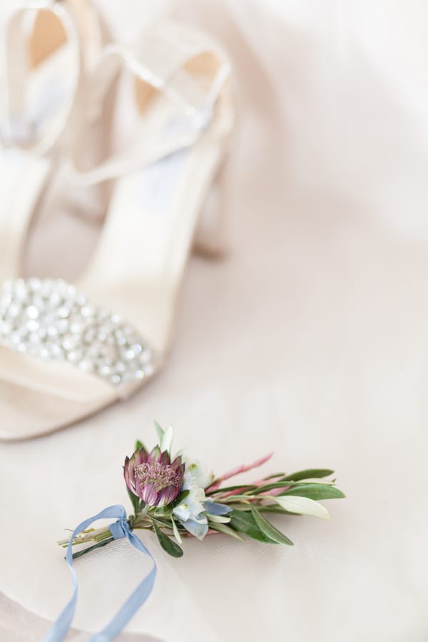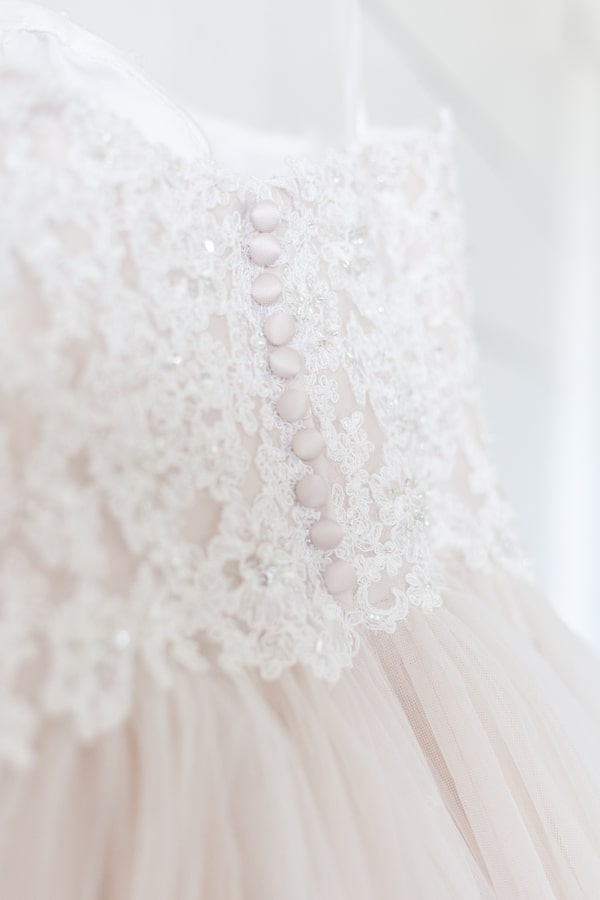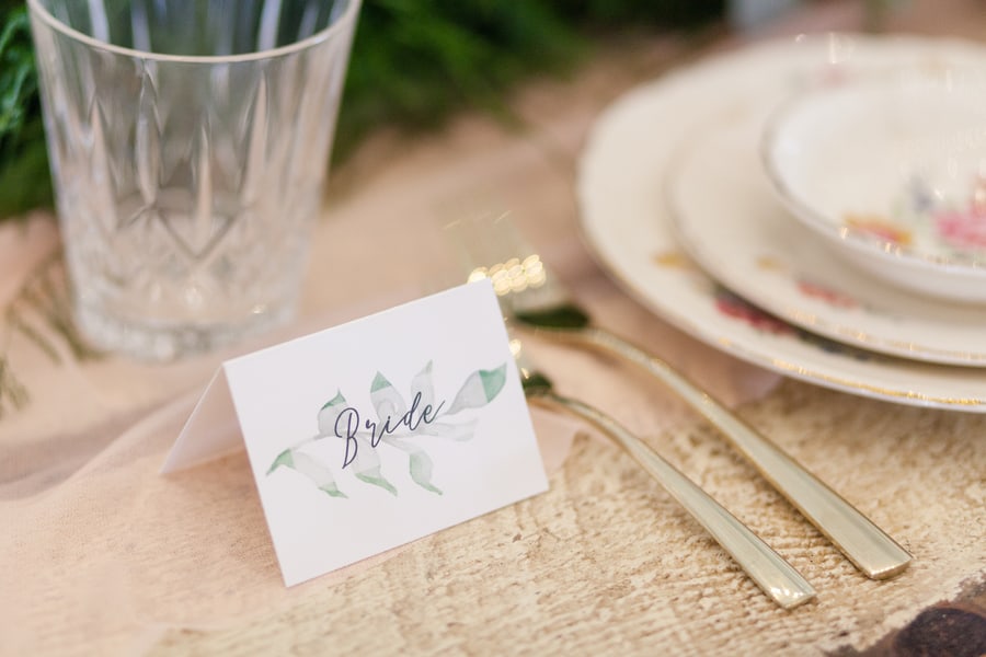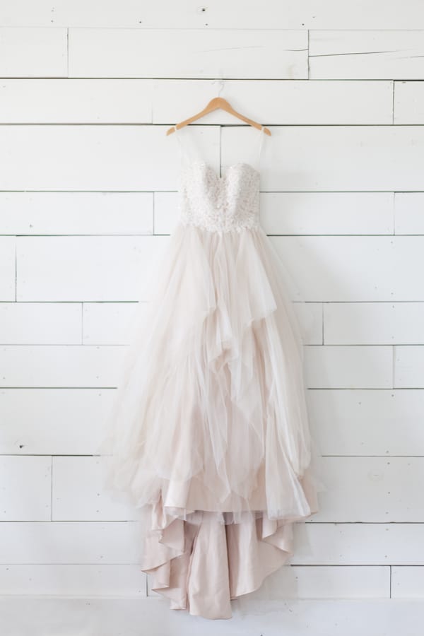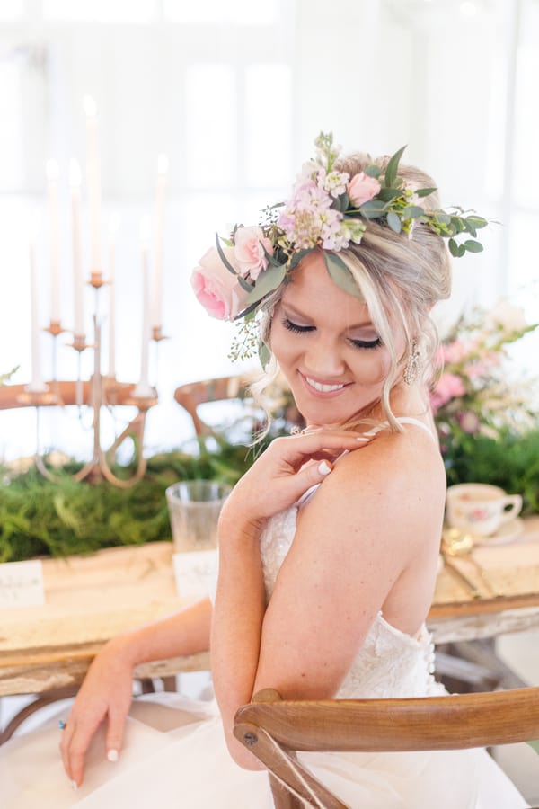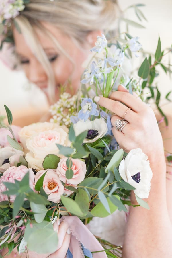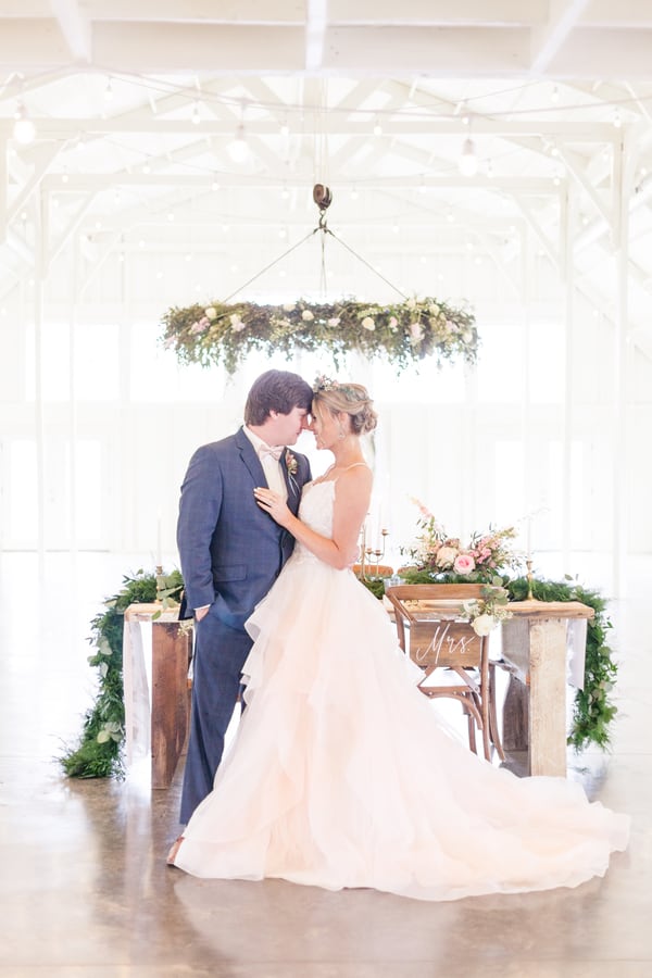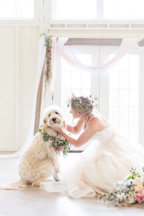 The all-white Kindred Barn served at the backdrop for this light and airy spring wedding shoot. The bride wore a blush toned Justin Alexander dress and carried an organic bouquet of garden roses, ranunculus, peonies, and anemones wrapped with blush and dusty blue ribbon. Milo, the golden doodle, was granted the honor of the one and only wedding party attendant. Milo wore a floral collar that matched the bride’s crown. The bride loves everything girly, especially tea cups so we incorporated vintage china in a floral pattern for each place setting.Gallery