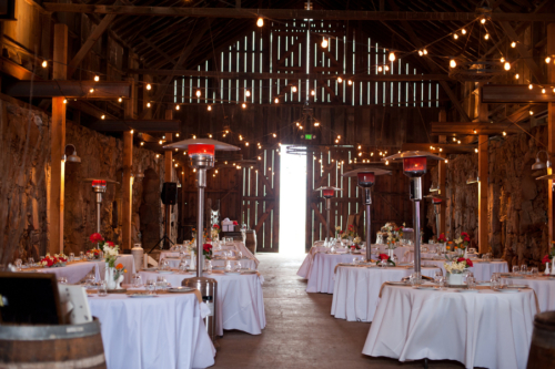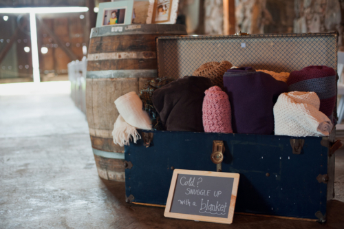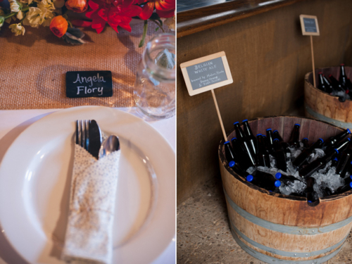 “DIY Projects were a bug part of Ethan and Angela’s wedding and they had lots of help form friends and family! Their beautiful invitations were designed by their friend Erin Dewey of the Flor Amarilla Etsy shop and were put together by the bride, the groom and an assembly line of friends who helped fold, stitch, paste, stamp and hand address! Their friends Erin also helped them complete the lovely bunting used on the reception tables, while Angela hand painted all the chalkboard signage. Erin also covered a large “E” and “A” cutouts in orange yarn to give the reception barn a bright pop of color!”