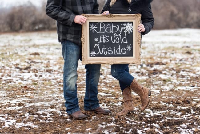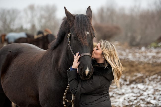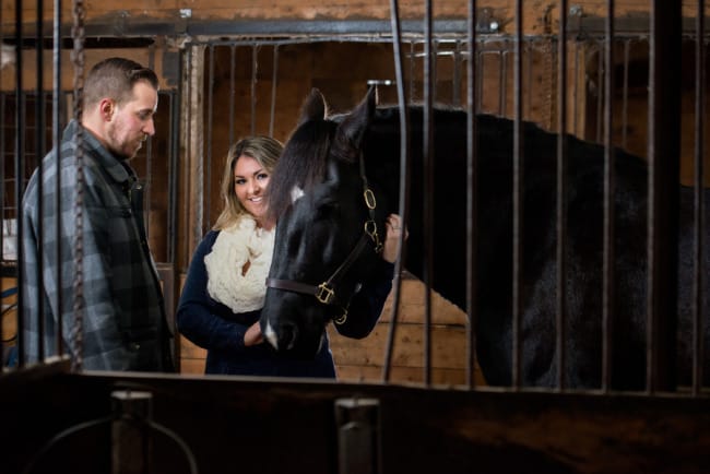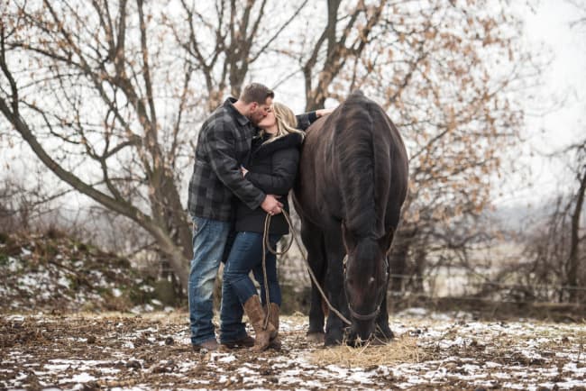 Although this is not a true engagement it is definitely a fun shoot with great inspiration for couples who have a love of horses. This also serves as a reminder: only 16 more sleeps until the first day of spring!Let’s hope we don’t need to feature anymore ‘baby it’s cold outside’ signs until next year!Photographer’s Comments: “Lisa and Kornell have been together for 7 years. They adopted a horse Maverick, which they board at Turnout stables in Kemptville, ON. Lisa has an event planning business and is excellent with decor and providing just the right atmosphere for any type of function. She staged her own shoot at the stable to highlight the bond between her, her husband, and their newly adopted beauty.”Gallery