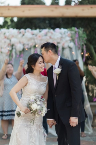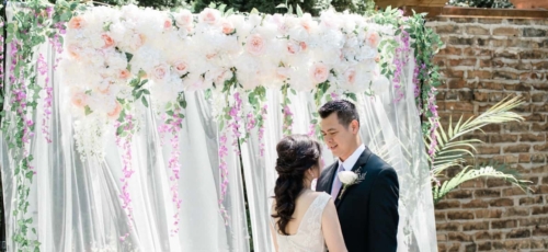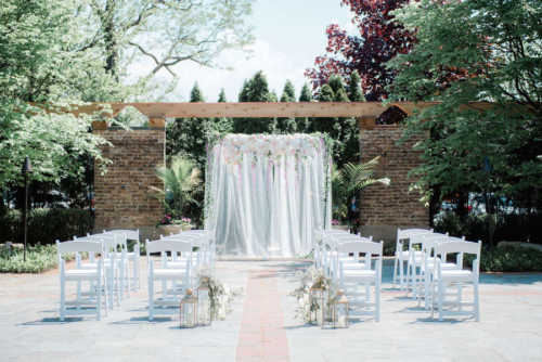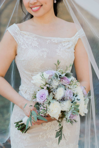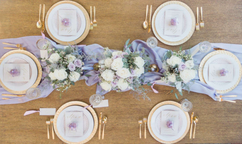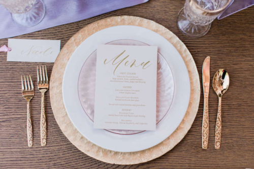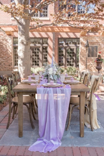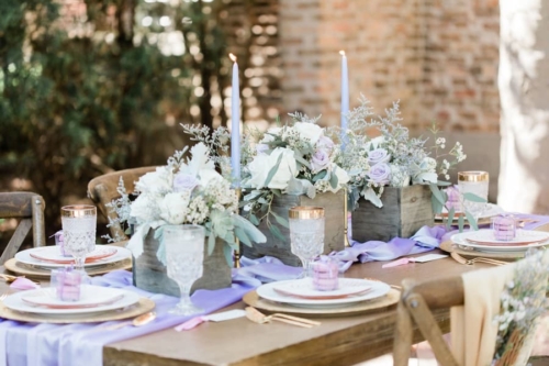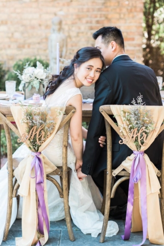 It was one of the hottest days in the Spring in Winnetka, Illinois. We put together this styled shoot in the beautiful grounds of the newly renovated Winnetka Community House, a historic Tudor Revival style structure in Chicago’s North Shore. Inspired by their gorgeous gardens with its brick brownstones and luscious greeneries, Michelle and Yasmin Photography, with the help of Savvy Rose Events, pieced together an overall look where rustic meets luxury. From the golden table settings and lanterns to the lush purple table runner, BJJ Linens and Boho Blush made the perfect combination for this design. Add them to the charming farm table, wooden chair and wine barrel and you’ll get a feast for your eyes. Courtesy of Style and Grace Events, the florals were made up of white and purple roses, succulents, dusty millers, brunia silvers and eucalyptus providing that soft look. The cake, a simple 4-tier in mauve and ivory fondant, was adorned with delicate sugar flowers which included roses, sweet peas, succulents and dusty miller leaves, all expertly handcrafted with bean paste by The Quintessential Cake. Emery Ann Designs gifted us with her elegant stationery incorporating purple and green florals and classic script font that screams romance. Our beautiful bride wore stunning novelty lace gown from Honey Bridal. Her romantic look was completed by Manifest Makeup and hair by Gia Tovar. PS: Our models are actually a real couple who has been married for 10 years (going on 11)! They already have 2 young, beautiful kids. They have always expressed regret of not having enough time for outdoor portraits for their wedding and wanted to have an anniversary session to make up for it. A simple anniversary session turned into a full blown styled shoot and they couldn’t be more happy with how the day turned out! We were all thankful for our wonderful vendors who made this special for our couple. It was such a great experience, despite the record heat of Spring in Chicago.Gallery