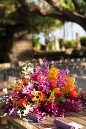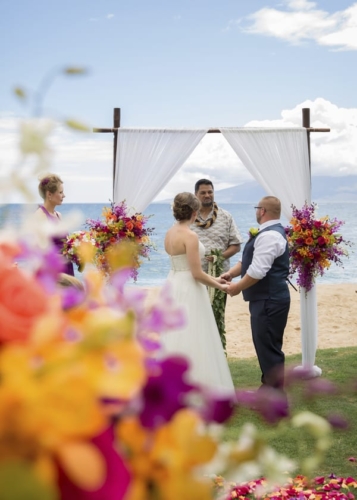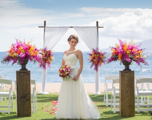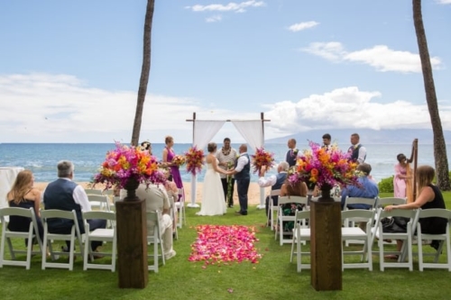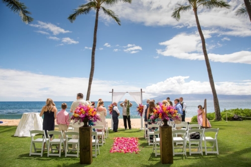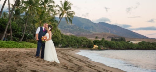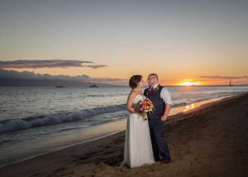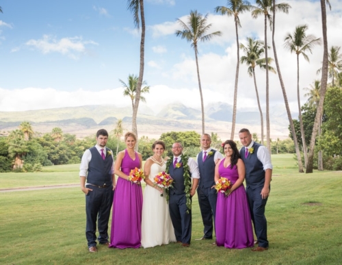 “Samantha’s morning began at the Kamaha’o Marilyn Monroe Spas. It was incredible. Being the only clients early that morning and the gorgeous ocean views out their big windows, was the most perfect start to the day. Just take a look at Sam’s stunning hair and makeup…absolutely gorgeous. “Though we hated to leave, from there Sam returned to her room for final preparations. When she arrived there was a wedding gift from Kyle. It was perfect, a small diamond studded, palm tree pendent. Something she will wear and will always remind her of Maui. “Time flew by and it was the moment we all came for. Their ceremony was so beautiful! As Samantha was escorted to Makai Lawn, a harpist played the softest Hawaiian music. With the music, the island view, the amazing tropical, colorful flowers and Sam’s soft flowing dress everything was perfect. Kyle’s big smile said it all, as he watched his bride come up the flowered aisle. Their officiant was wonderful. He incorporated the Hawaiian wedding traditions in the ceremony and truly added warmth and love into the vows and ceremony! Look at him sounding the shell horn as they walked back up the isle! “After the ceremony, we photographed their family and all the friends that came for their celebration. Being at a resort, we took advantage of the beautiful gardens for their formal pictures. Though a bit warm, these two looked amazing. The reception was entertaining and delicious and such a fun change for us. So glad Kyle and Samantha let us sneak them away for a few sunset pictures!”Gallery
