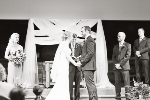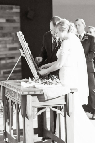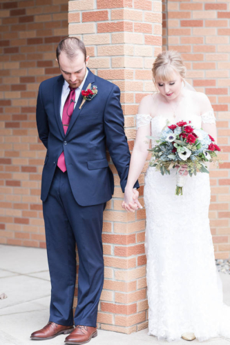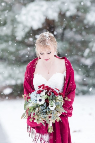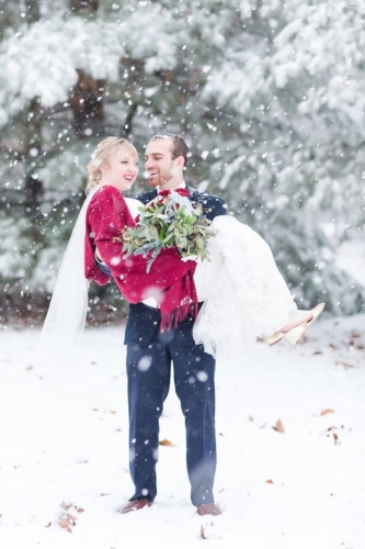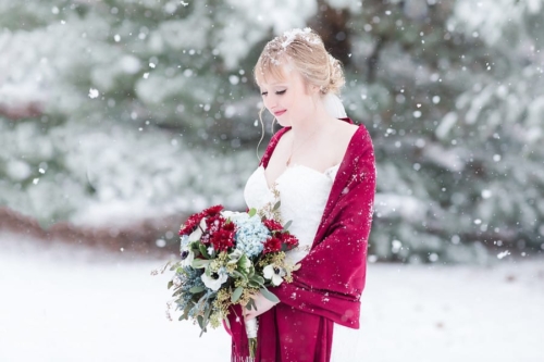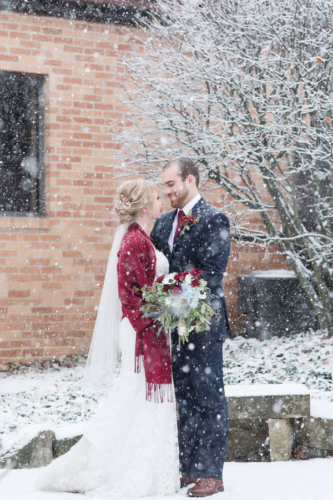 Photographer’s Remarks “This past weekend I had the most unexpected magical winter wedding! In late November, Sara and Peter were planning a fall wedding, but Mother Nature had other plans! The day started off with overcast gray skies and mild temperatures. I prayed the expected precipitation would be snow and not rain. I never could have imagined that three inches of snow would fall in a few hours in big huge fluffy flakes! This wasn’t just any snowfall. It was the wet snow that clings to tree branches and turns the world into a magical winter wonderland!” FAMILY TIES “Family is so important to Peter and Sara and that was evident in everything about their wedding day. From the date itself to the details, to the reception speeches. Above all, it was evident in their approach to creating a Christ-centered marriage. They began investing in their family even before the ceremony. As they spent time planning their wedding day they also attended a marriage class called Becoming One, where they learned tools for building the foundation for a strong marriage. “To symbolize the foundation of their marriage, Sara and Peter choose to incorporate a knot tying ceremony into their wedding. They made the beautiful wooden plaque they used for this tradition based on the verse “A strand of three cords is not easily broken” – Ecclesiastics 4:12. “Sara’s grandma, is an amazing basket weaver, and wove baskets for the wedding day–for the programs, the flower girl… As Sara was growing up she spent many hours with her grandma sharing their love of basket weaving. Sara and her grandma have such a close and special relationship. When she and Peter picking a wedding date, they choose to share the anniversary date of Sara’s grandparents and an aunt and uncle, too!” SOMETHING BORROWED, SOMETHING BLUE…. “Sara had the sweetest, most sentimental bridal details! All of the women in her family for three generations have worn the same necklace on their wedding day. Sara borrowed her moms earrings, that went beautifully with the necklace! Just days before the wedding they stitched a heart cut from the lining of grandma’s wedding dress into Sara’s dress with blue thread. What a sweet tribute of this bittersweet day for Sara’s grandma, who lost her husband suddenly and unexpectedly over the summer. Are you crying, yet? Because I’m crying as I type.” FIRST LOOK WITH A TWIST “I can’t recommend first looks enough! Sara and Peter put a lot of thought and prayer into their decision to do a first look. As a result, they put their own twist on the first look. Before their first look, they had a first touch around a corner, praying together for each other and their marriage. Then they moved right into a first look. A beautiful, emotion filled-first look where he swept her off her feet and spun her around! We then moved into portrait time and it quickly became time for the ceremony! That’s when it happened! We went into the ceremony with drab gray skies, and came out of the ceremony to a magical winter wonderland! “I could go on and on about how special this couple is. How their day was filled with love, joy, fun, friendship and family, but we’d be here all day!”Gallery