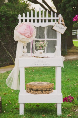 We love this all white vintage writing table converted into a cake stand – beautiful design!