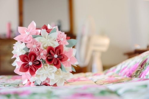 - The bride created paper flowers for the men’s buttonholes and for her bouquet. She chose a vibrant composition of coral pink and glowing red to brighten the delicate pink, Âgreen, and Âivory palette of the wedding.