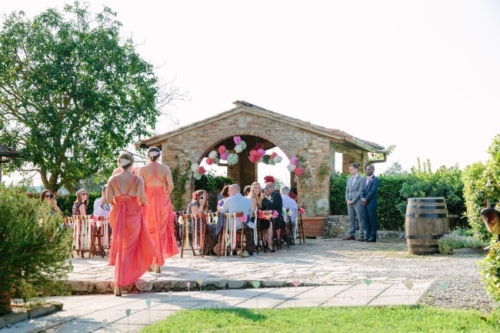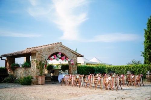 Lauren and Tom chose one of these farmhouses – Casale di Montelodoli – as the location for their wedding. It is a stunning traditional country house on top of a hill, surrounded by a beautiful garden with a private swimming pool and a stone cottage. It overlooks the Chianti vineyards, the perfect location for a small, intimate wedding.