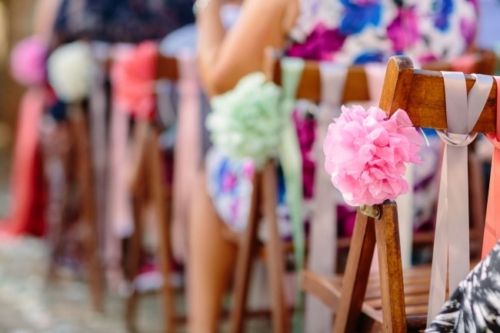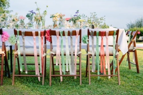 - Friends cut meters of multiÂ-colored ribbons to decorate the chairs at the long table where dinner was served.
