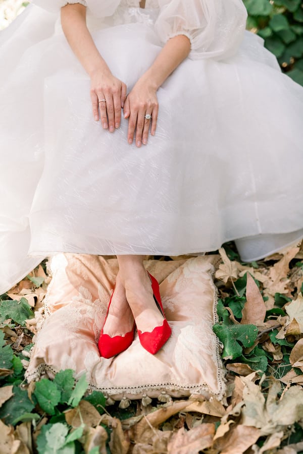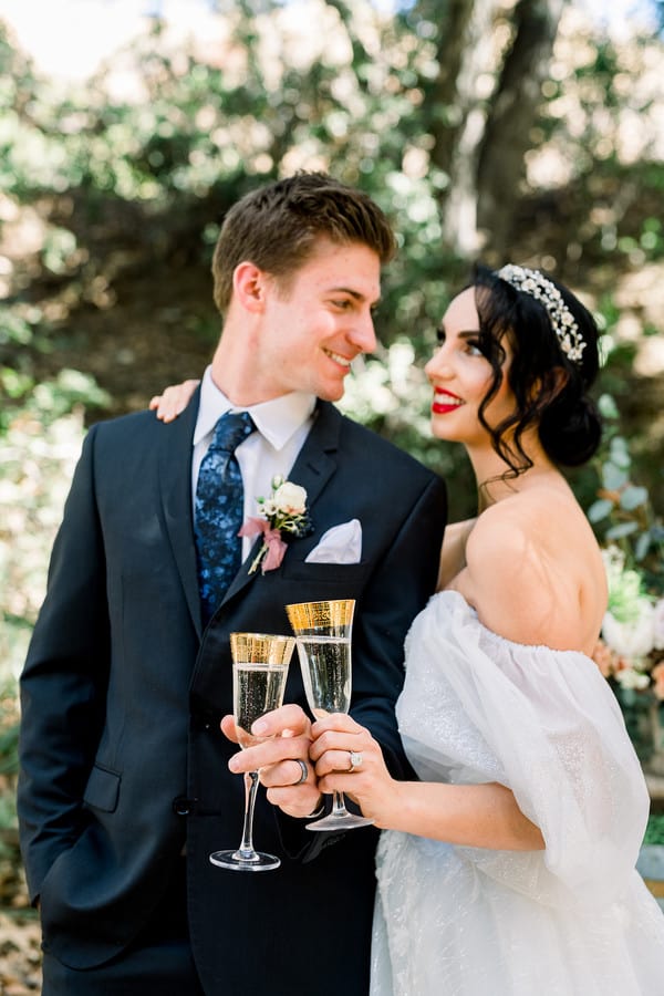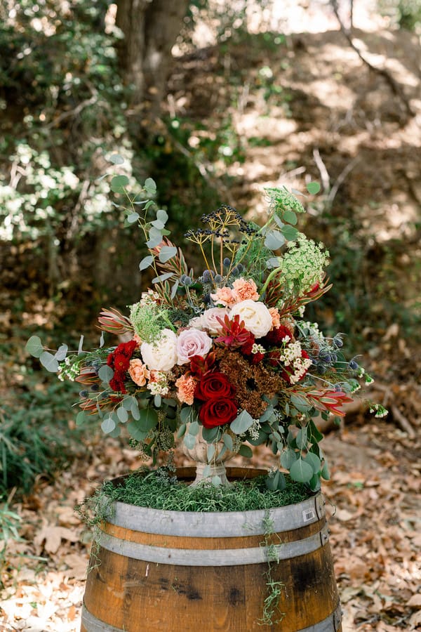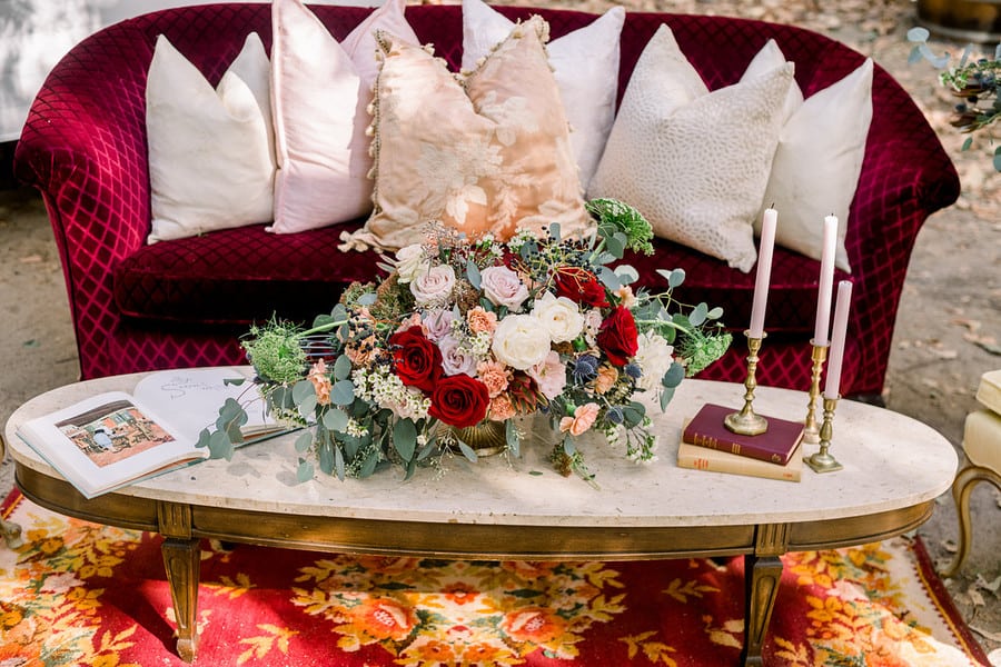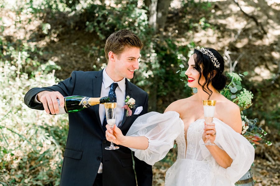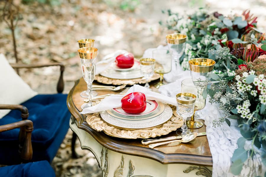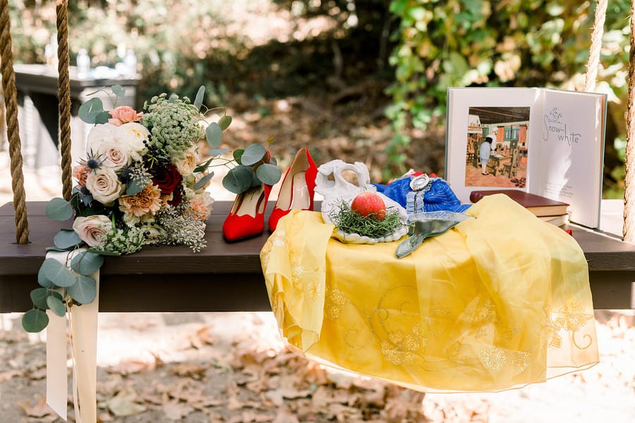 Event Planner’s Comments: “Once upon a time, nestled in the rolling hills of Del Luz, CA – there was a magical estate, Luna Bella Ranch. There you will find lush green, wild grapevines and gorgeous trees that cover the sky. This estate makes one feel as if they are in a magical land far far away. Here, you will lose your WiFi connection and escape all reality (which we all truly need). It is here that you can marry your Prince Charming and live happily ever after. “With these magical sentiments in the air, it was easy to design and curate a styled shoot-inspired featuring the one only Snow White. I drew my inspiration from the unique aesthetic that Luna Bella Ranch offers, and it all truly fell into place from there. “I wanted this shoot to encompass a modern Snow White fairytale, but I did not want to lose sight of the wedding elements that we all desire (white gown, gorgeous florals and of course a bride and groom). With these elements in mind, I hand-selected each creative involved based on their own unique talents, and I couldn’t have dreamt of a more perfect team! “Once the creatives were chosen, I “whistled while I worked” to design and curate each detail needed for this shoot (styled lounge vignette, ceremony elements and, of course, a cake). Once my designs were complete, meetings with Shawna from Bleudog Floral were underway to finalize her floral designs, which by the way, were one of the most influential parts of the shoot. I mean, what’s a styled shoot without stunning floral elements, right?! And let me just tell you, Shawna is the best of the best! “The day of the shoot, every creative was hands on deck (btw I’ve never experienced this before, it’s typically me, myself and the photographer). To have everyone’s creativity readily available made shooting these stunning images (Photo Cred: @HollySigafoosPhoto) even more magical! “To name a few, Birdie in the Barn was hands-on with styling different elements (barware, tablescapes & more) to make sure we captured each and every detail, flawlessly. “At this point, you’re ready to take a bite out of the poison apple as I know you’re “dying” to see these stunning images – so do yourself a favor and scroll, to witness the pure MAGIC yourself! Lastly, In the wise words of Snow White, I hope you always remember “that you’re the one who can fill the world with sunshine!” Happily Ever After, The One Occasion”Gallery