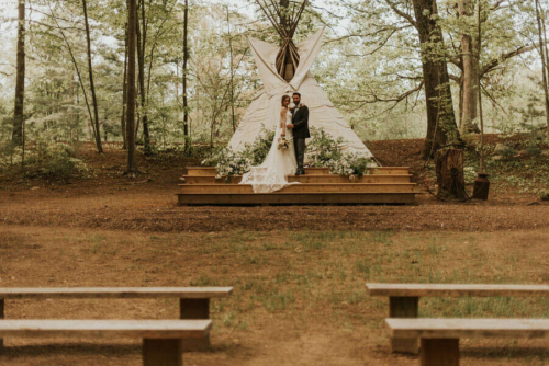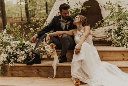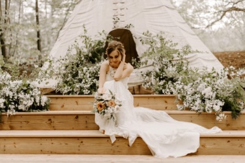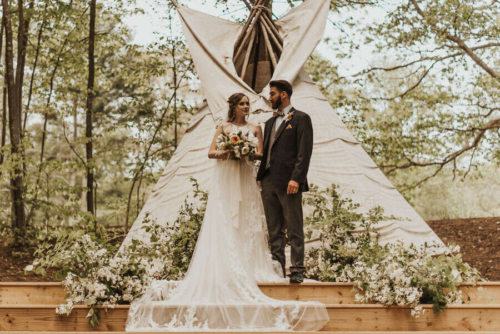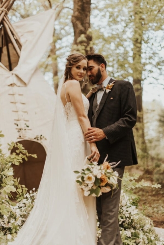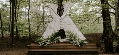 Vendor Comments: “We wanted to create a styled shoot that not only stands out to couples on the East Coast that are planning a wedding but also to all Love & Lavender readers that might be unaware of the potential that Connecticut offers. This state along with the rest of the East Coast provides ideal beaches and vineyards as backdrops but what about the couples in this area that are looking for something a bit more unique? “Tamarack Lodge is a fairly new venue for adventurous couples that are inspired by off the grid, woodland weddings without having to travel out of New England! The venue provides many options for ceremony locations, but what they’re known for is their tipi in the woods with a babbling brook and rustic benches for all the guests. “Our florist decked out the tipi with so much greenery to make the site look beautifully overgrown and enchanting. You truly feel fully immersed in nature during the whole experience that this venue offers. “Even when inside the lodge, there are so many nods to the great outdoors (including taxidermy for those that are into oddities!) “We wanted the feel of the wedding to be soft, moody, and intimate while incorporating lots of vintage elements to create an almost abandoned secret garden vibe. “There’s so much potential to incorporate festival, boho, glamping, or romantic/vintage styled weddings at Tamarack Lodge and we as wedding vendors hope that this shoot can show readers that you don’t always have to travel very far to have the wedding of your dreams.