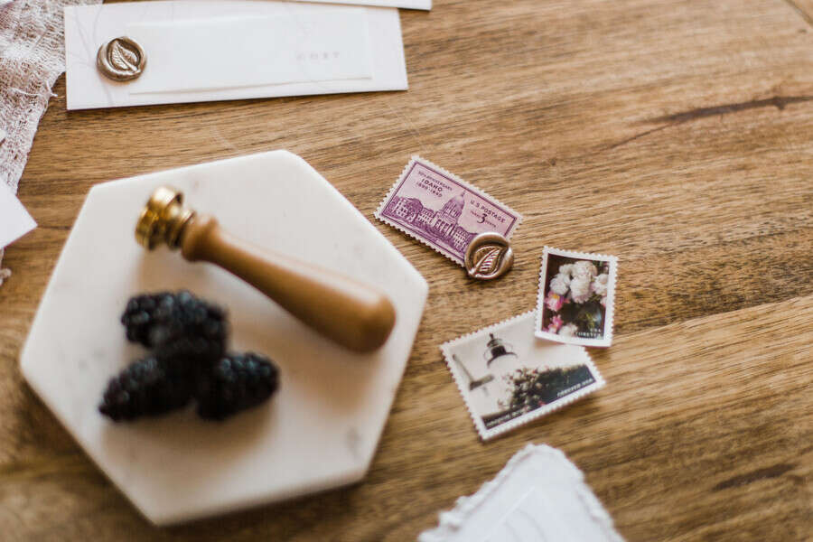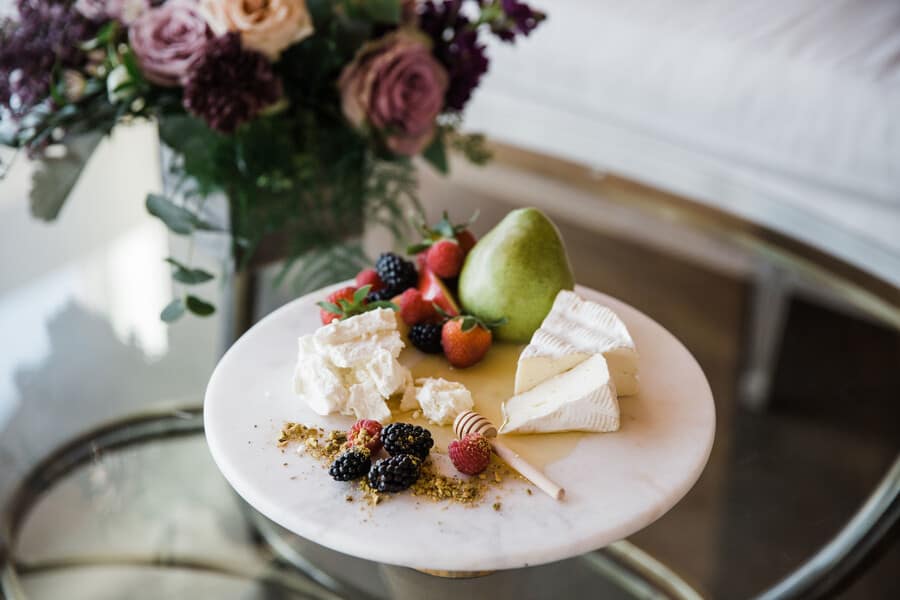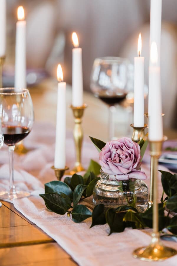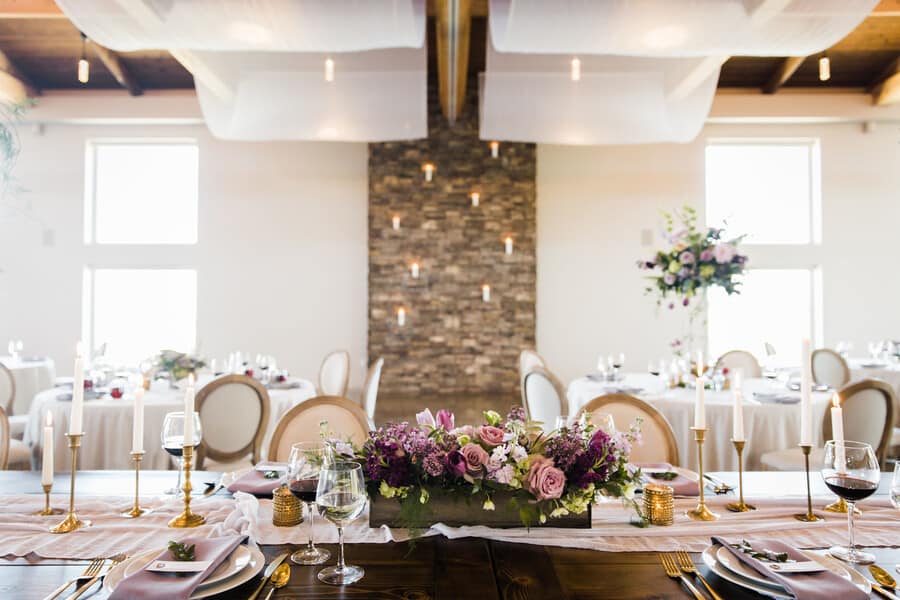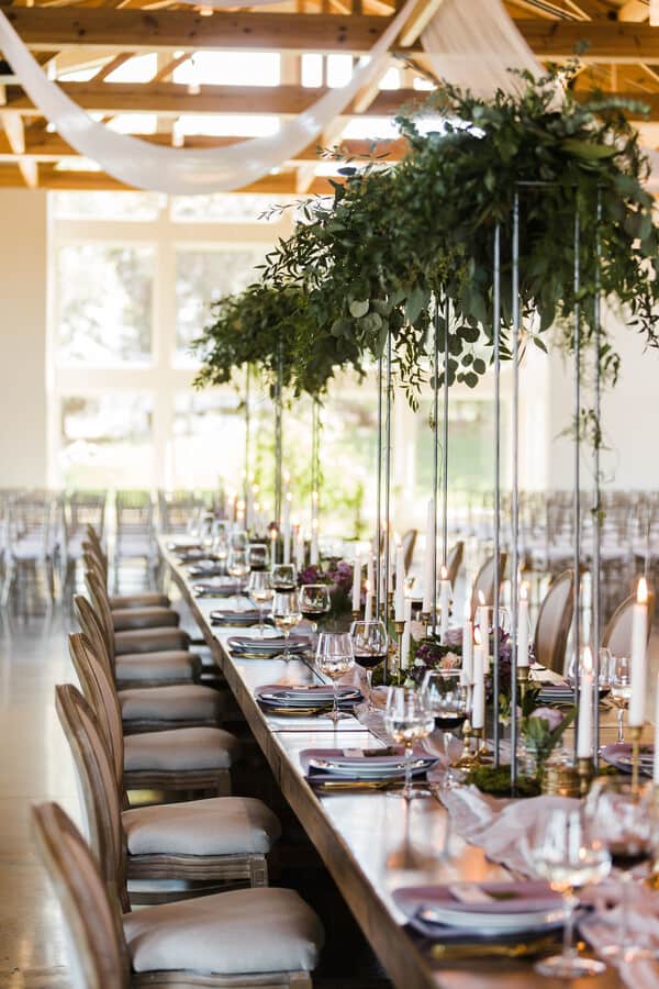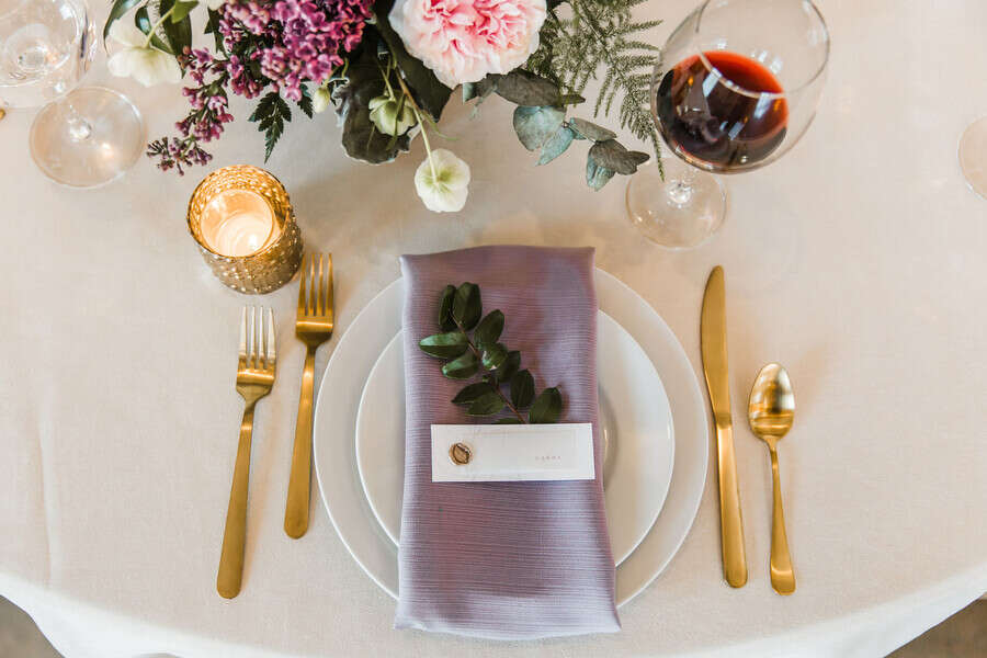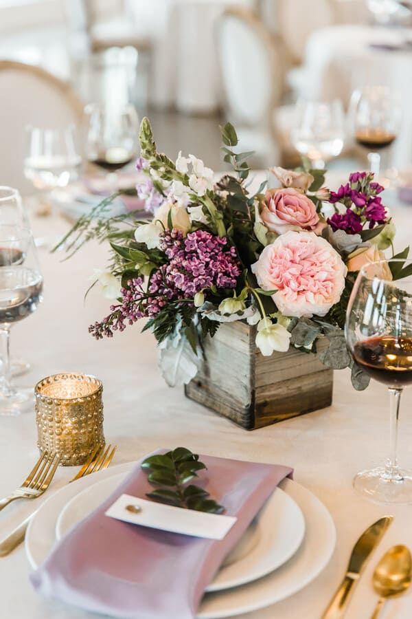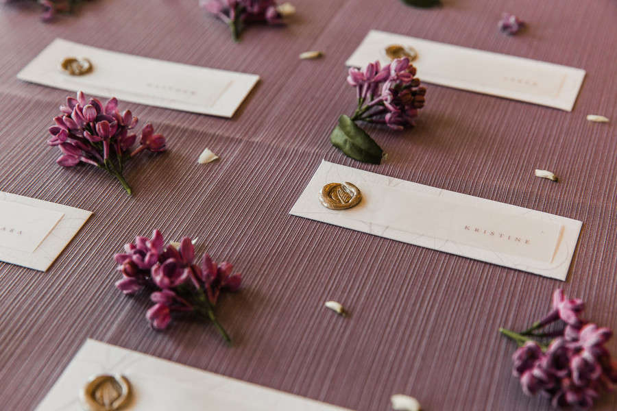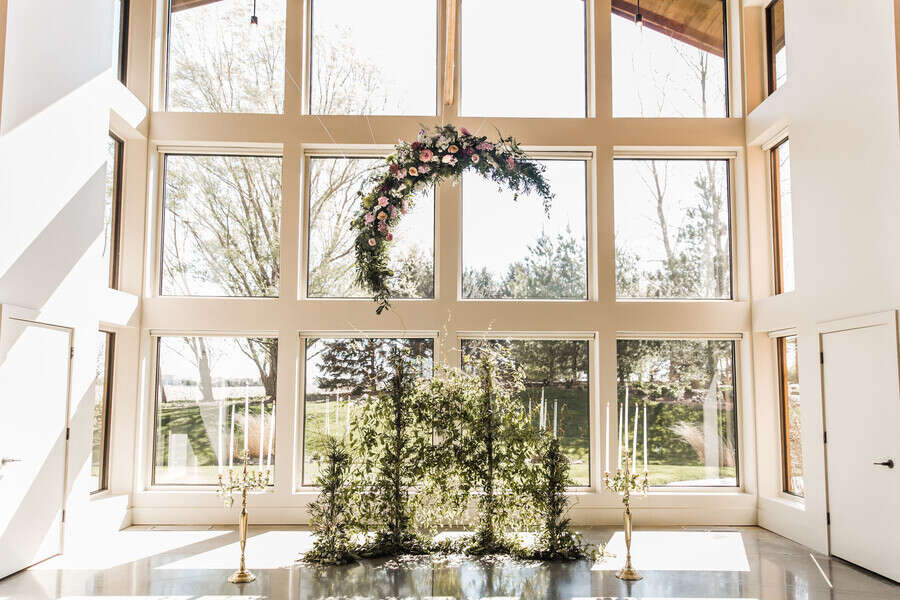 Photographer’s Comments: “It was a long winter in central Illinois this year. So when Pear Tree Estate asked us to collaborate for a styled shoot/tasting in April, we jumped at the opportunity to create some natural beauty. “We used lilacs, blush & mustard yellow roses and a lot of mixed greens for a natural, yet fresh new feel. We incorporated some new design elements by fashioning a hanging floral crescent over the ceremony area with a twiggy/green backdrop and creating mixed foliage pergolas as a tall focal on the harvest tables. “The large focal elements however in no way outdid all the wonderful details of this styled shoot such as ivory velvet tablecloths for the round tables and soft gray gauzy runners on the harvest tables. “Your mouth will water by just looking at the food and dessert photos and gazing at each beautiful flower photo will make your heart dance!! “Our beautiful model couple came back to celebrate their 5th anniversary by modeling for us in the same venue in which they were married!”Gallery
