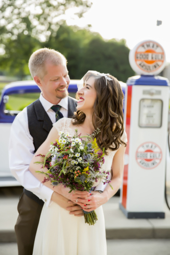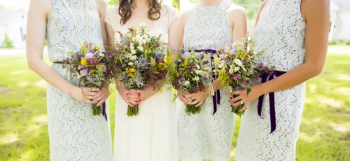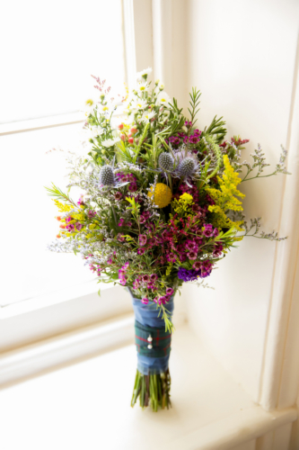 “Wildflowers, with nods to Damon’s Scottish heritage (white heather and thistle) and nods to my Polish background (rosemary). Â And a bonus to the budget, our florist picked the thistle from the side of the road.” Â