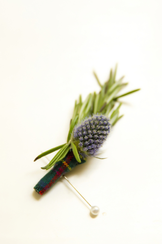 “My now-husband had his outfit picked out before I found my dress. Â He ordered a wool vest from Scotland, and he wore his clan Kennedy tartan tie. Â The men’s boutonnieres were of thistle and rosemary bound in clan Kennedy ribbon. Â We pulled our wedding colors from the colors of the clan Kennedy tartan: navy, purple, forest green, red, and yellow.” Â