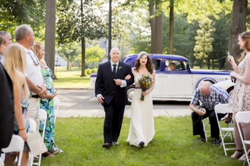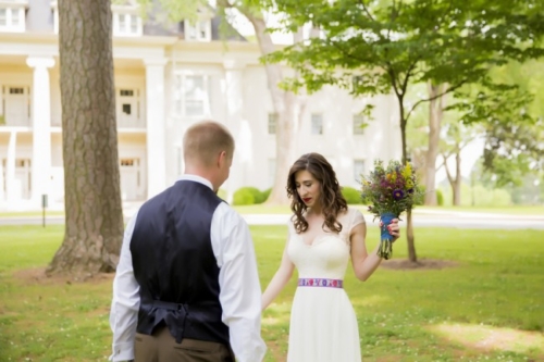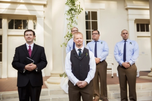Photographer’s Comments: “Everything about this wedding day was filled with tradition, history, and culture. From the groomsmen’s boutonnieres to the bride’s attire, there were so many traditional details that incorporated Stephanie’s Polish lineage and Damon’s Scottish lineage. “This wedding between Stephanie and Damon took place at the picturesque Founders Hall in Athens State University. Founders was built in 1842 by the Tennessee Conference of the Methodist Church on five acres of land donated by the Maclin/Hobbs family. In addition to the various offices, Founders also houses a parlor and chapel, and is listed on the National Register of Historic Places. “As Stephanie was having her makeup and hair done alongside her bridesmaids upstairs in The Chapel, Damon and his groomsmen were downstairs getting ready in one of the classrooms. Damon’s tie and the groomsmens’ boutonnieres were wrapped in Damon’s Scottish clan tartan. Damon and the groomsmen kicked off the Alabama wedding day by toasting a glass of their traditional scotch. “Stephanie and Damon decided to have a first look before they actually tied the knot. Stephanie was escorted by her dad down the aisle after they entered the ceremony in a 1934 Cadillac. The ceremony was filled with bluegrass and Celtic hymns. “After the ceremony was over everyone made their way to the courtyard which is just behind Founders Hall. During the reception there was a traditional polish apron ceremony which is where Stephanie’s mom took off her veil, and Damon’s mom put on her headband and tie on the apron. Everyone had a fabulous time during the reception dancing to all of the fun bluegrass tunes. Stephanie and Damon made their grand farewell as everyone formed a line to the getaway car while shaking their metal noise makers.”