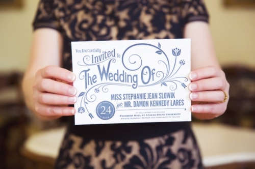 “Due to the short engagement, we customized our invitation design via Minted.com and chose the Vintage Blush Wedding Invitations (they have a quick turn-around time)! Also, our friend is a graphic designer by trade and designed our Order of Service/Programs to capture a similar feel as our invites.  She also designed all the signage we had around the reception.” Â