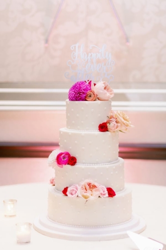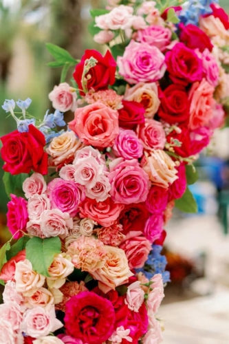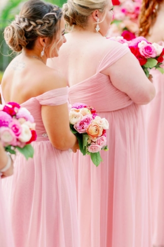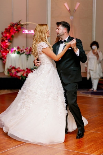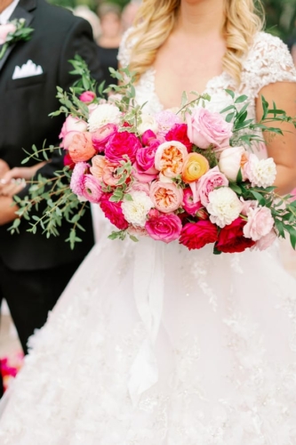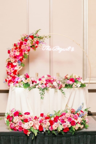 They were going to “summer flower garden” vibes, and they definitely achieved that with their outdoor ceremony. The aisle was lined with flower petals leading up to a beautiful floral circle arch. Their colors were ranged from blush to hot pink with metallic accents. They also had a pink neon sign at the sweetheart table at the reception that read, “The Bryants”. Their wedding was full of sweet details from beginning to end. I especially loved their sparkler exit.”