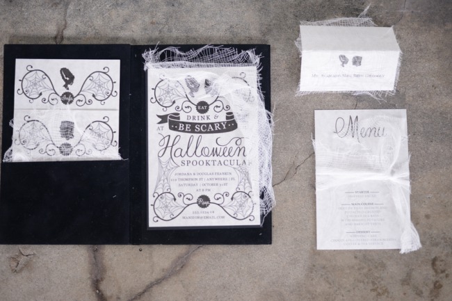“Over the Top’s linen Molecule provided the perfect cloth to dress the large estate table, and spooky paper products covered in gauze-like fabric from The Invitation Lounge finished each place setting.”