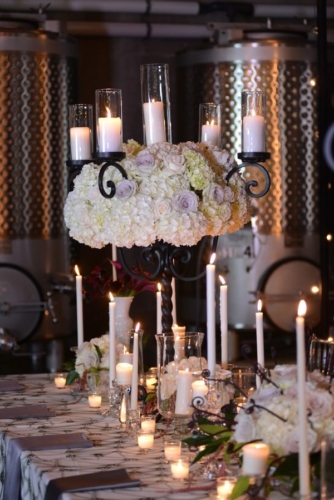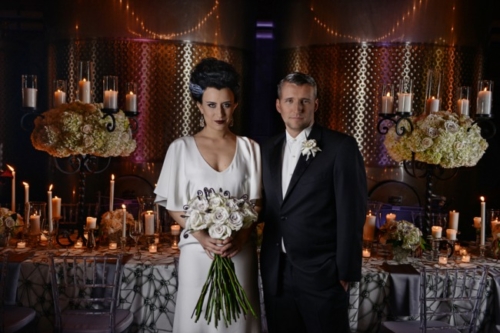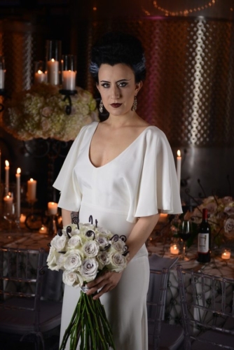 “As a nod to the original film, the bride’s make-up featured stitches painted across her jawline, and her hair featured the iconic lightning bolt streak. In keeping with the black, white and grey tones of film noire, a lavish table set for the festive occasion featured custom made black wrought iron candleabras, and lush florals of antique greyish-lavender Amnesia roses, white Blizzard roses, blush White O’Hara garden roses, white hydrangea, black callas, dark purple monkeytail fern curls — and of course, dozens of candles, perhaps to keep the sad and tragic monster that loathed fire away from the nuptials.”