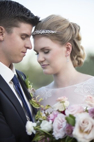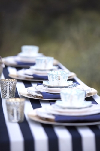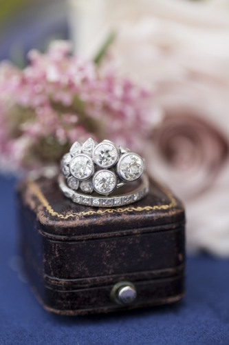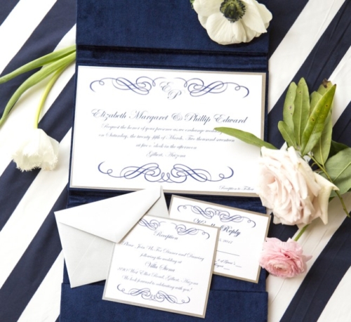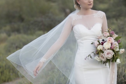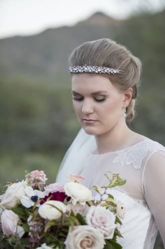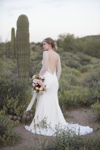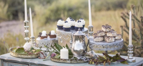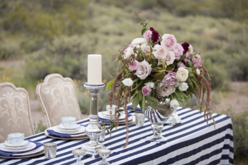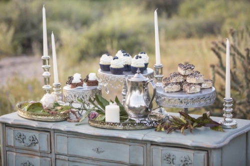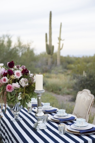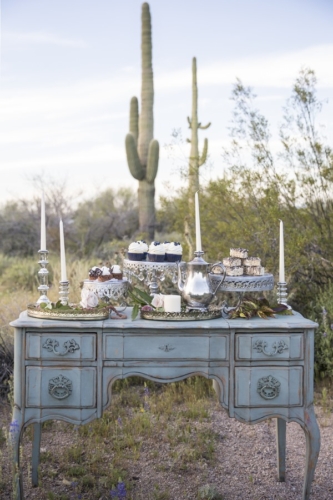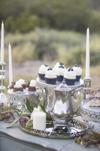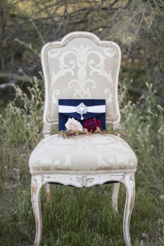 Photographer’s Remarks “The inspiration for this shoot all came from the fabulously creative mind of our stylist and planner, Karen Podrasky, from KDP Events. Here is her description of her inspiration: ‘My grandmother immigrated from Liverpool, England to the United States when she was just 20 years old. She landed in New York’s harbor with very few belongings. These blue ivy tea cups were of the select transported treasures. The fondest memories I have of Grandma Edith were her sophisticated British accent and teatime. Styling this photo shoot was very much inspired by those little pieces of china. We selected the location as a nod to that little girl who shared teatime with her grandmother. The Usery Pass Mountain area is one that these little feet have hiked dozens of time on family outings. Pass Mountain with it’s wind cave and recognizable red stripe was a preferred destination for camp outs and picnic birthday parties. Rachel Leintz Photography captured the mystery of the landscape and the intimacy of the high tea decor with mastery. The floral designs by Posies Floral enhanced the natural setting without trumping it’s beauty. This one granddaughter was delighted to have been a part to this magical scene.’ “The navy and white striped table drapes, along with the gold accents made a regal yet whimsical background for the British fine china table settings and cutlery. “The invitation suite, created by the talented folks at Posh Invitations, is a deep navy, velvet clutch, adorned with crystals and a white satin ribbon. Photographing the beautiful calligraphy of the invite on top of the navy and white stripes created my favorite detail shot to date! “The clean lines of the Verona dress (by Katie May) cut dramatically against all the intricate textures of the blooming desert. “The sheer illusion netting on the sleeves draws your eyes from the delicate details on the shoulder, down the arm to the rich and pale blooms of the bouquet. We added a rough-cut crystal tiara to the ensemble to finish off Tayele’s royal queen of the desert look. “The art deco diamond ring used in the shoot is a family heirloom from the 1920’s. Each diamond is a miner cut — cut by hand to remove flaws and to allow the brilliant cut to sparkle under even the dimmest candle light — and is a combination of each woman’s engagement ring from generation after generation. “The little finger treats made by Sweet Simplicity Cakes, added the finishing touch to our high tea time in the desert. The cupcakes, infused with blueberries and lemon, followed our gold and navy motif. The chocolate covered butterflies helped add in another whimsical touch.”Gallery