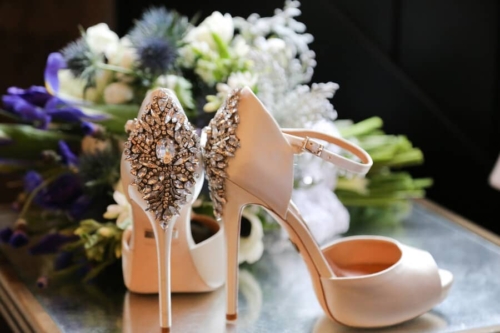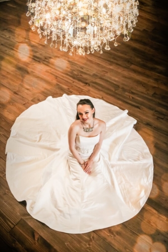 “Our bride looked sleek and sophisticated when she wore a simple strapless, satin fit and flair wedding gown which featured a beaded satin ribbon sash and back button detail. She was frosted with a large crystal necklace, graduated dangle drop earrings and matching bracelet. Her look is only completed by her sexy and dramatic Latte Satin jeweled peep-toe pumps.