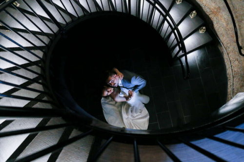 “A beautiful black wrought-iron spiral staircase inside the textured concrete walls had modern touches with simple light fixtures, mirrors and lit metal hurricane lanterns. It made a bold and stunning setting for freezing time with a picture.”
