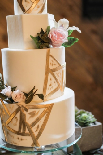“The cake was a four tier round white cake with one layer in a pentagon shape. The four tiers had gold geometric shapes that agreed with the live green succulents at the base of the cake.