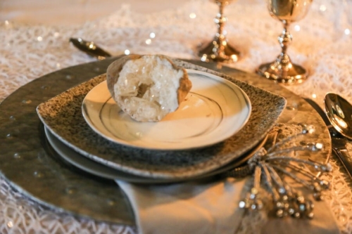 “The decor was simplistic using glass topped wine barrels with black metal high top stools. The centerpieces were glass globes with fairy lights and coin sized eucalyptus circling around. Metallic accents with a variety of textured pieces were the goal for the sweetheart table settings. It was a delightful grouping of metal chargers, stoneware and marble plates and different kinds of gray linens, topped with white crystal geodes.