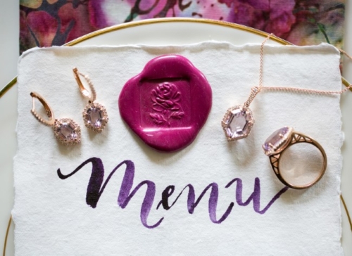 “Gathering inspiration from the rare minerals and rocks of South Dakota, we created this styled shoot. Rose quartz is the state mineral of South Dakota, so we designed the shoot around the rose quartz jewelry the bride wore and styled the table with several varieties of rocks, colors, and textures.