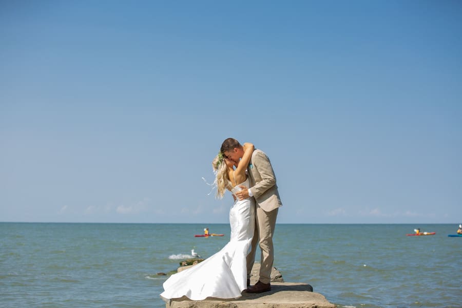 Photographer’s Comments: “Never have I met a bride that was more perfectly named. Summer’s parents were right on the mark when they named their little blond baby, Summer. Everything about her makes you think of summertime. Not only her sun shiny appearance, but also her happy light-hearted personality. “And with the wedding themed around the feel and look of summer at the beach, it all fit perfectly to this couples personality and relationship! “Will and Summer’s Avon Lake wedding was held lakeside at Avon Lake’s well known Lake House. “The wedding ceremony kicked of with a bit of a social hour with games and refreshments. Shortly after the social hour, the ceremony began with Summer’s brother singing and playing the guitar. “Then the adult flower girls entered, as well as her sweet bridesmaids, and adorable nephews pulling up the rear for the bride to enter. The ceremony had special moments and I loved how they include much of their families. “Topping the day off was the awesome reception at Georgetown & Vosh in Lakewood! I love this venue. Georgetown’s stunning outdoor patio is so perfect for a summer wedding. Then inside of Vosh, the space is inviting and fun. “Will & Summer decided to have food stations that were open for a couple hours instead of a formal sit-down dinner. The food was fantastic and it seemed everyone loved the easy access!”Gallery
