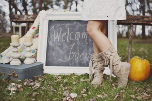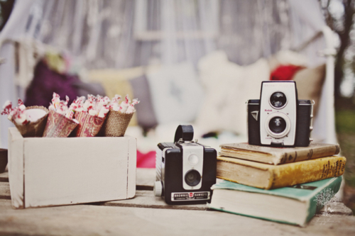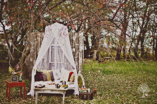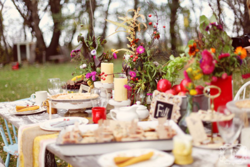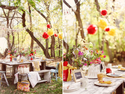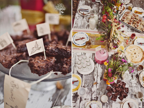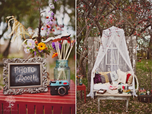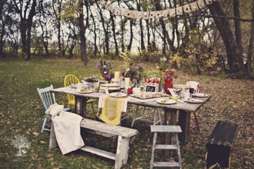 Don’t you just love going to the local flea market and antique stores to snoop and see what there is to find? You can always be sure to find an item or two that might need a little TLC, or you might strike gold and find a treasure with no assembly required. Either way, it is always fun to go and see what there is to be had! What better way to spend an afternoon than an outdoor picnic with flea market and antique store finds. We’re starting this week off with a delightful party thrown by Rosie of Simply Rosie Photography! She and her friend Rosella gathered everything from flea markets, antique stores, and thrift stores and planned all the details for a creative “Thankful for Friends” party. They did an amazing job! Rosie’s friend Bethy of Eden Photography also came to the party, so we’ve included some of her shots as well! Guests were welcomed by a chalkboard sign and a bird cage full of favors that held lavender scented rice sachets with the names of all the guests attached! The table was crafted out of an old barn door by Rosie’s husband! An assortment of rustic and shabby chic chairs and a few old benches were arranged around the table for the guests to sit on. Rosie and Rosella decorated the area with red and yellow tissue paper pom poms and a burlap banner with fabric rosettes attached. The place settings were an assortment of plates, saucers, and coffee mugs found at thrift stores. To complete them, Rosie tied up vintage napkins, berries, and cinnamon sticks with twine. The menu was all home baked goodies: chocolate chip cookies, brownies, apple pies, butter pecan tarts, raspberry ribbon cookies, and pumpkin tarts! They also served coffee fresh out of a french press, cold milk in antique milk jars, and tropical punch! Rosella and Rosie also added cute vintage stamped labels and flags to all the food. They even antiqued the paper themselves! The photobooth is our favorite detail. We love the daybed with the sheer canopy, and the props were absolutely perfect too! Rosella sewed most of the pillows herself and they added a few old quilts and a backdrop made with wood from the same barn as the table! To complete the photobooth, Rosie and Rosella added old books, cameras and a box of candies for the guests to enjoy while lounging on the daybed. The guests used Rosie’s instapix mini to snap self portraits or group shots, complete with mustaches on sticks! Then, they used mini clothespins to attach their pictures onto a tree! Thanks ladies for sharing this adorable party with us!Gallery