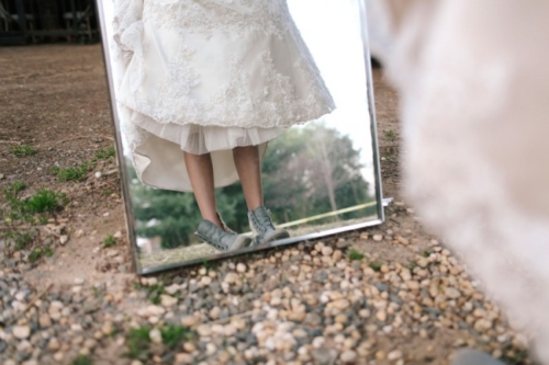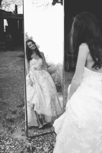 “She brought all kinds of home made goodies — fabric streamers made by her & her mother from thrift store dresses, a favorite pair of boots, blue beads that were once her grandmothers and a bargain wedding dress that made her look like a million bucks.