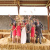 Bridal party standing on haystacks throwing hay at Swans Trail FarmsPin