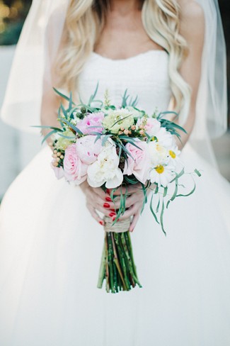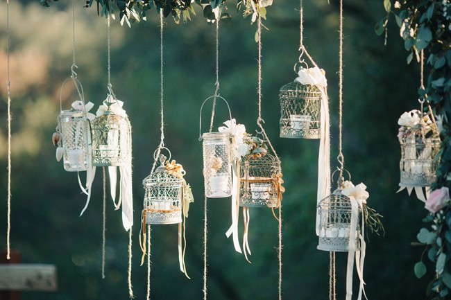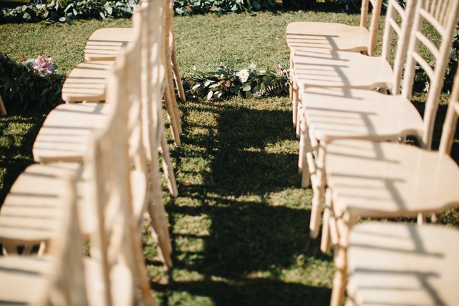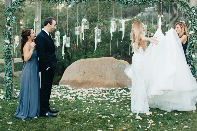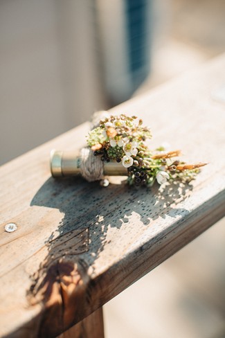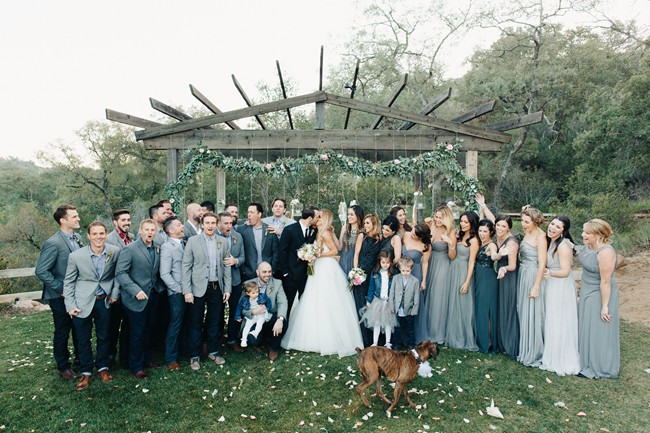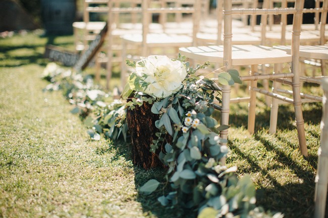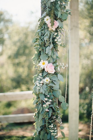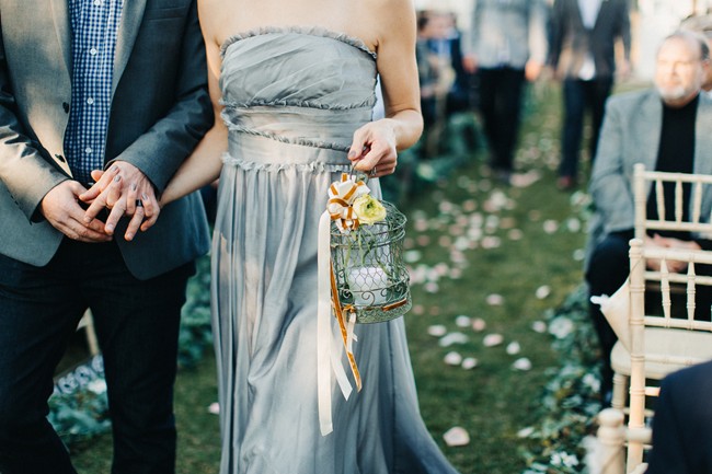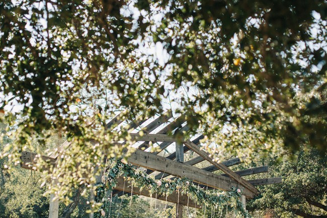 Remarks from the bride: “We opted for greenery over florals, as the ceremony and reception were both outdoors. There was lots of lush eucalyptus with peonies, hydrangea, and wildflowers sprinkled in. The ceremony aisle was lined with tree stumps holding candles, reclaimed wood signs to help people find their seats, and rose petals. Our alter was a blanket of rose petals and eucalyptus was hung on the arbor. The bridesmaids walked in carrying mason jars and bird cages accented with ribbons and flowers and each girl hung their jar or cage from a string hanging from the arbor. Thus, the bridesmaids slowly decorated the arbor as they walked down the aisle. Guests were given wooden cones filled with feathers to toss at the bride and groom.”