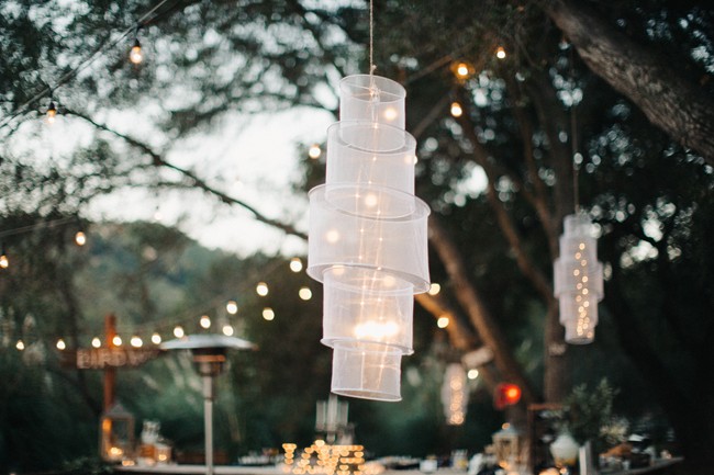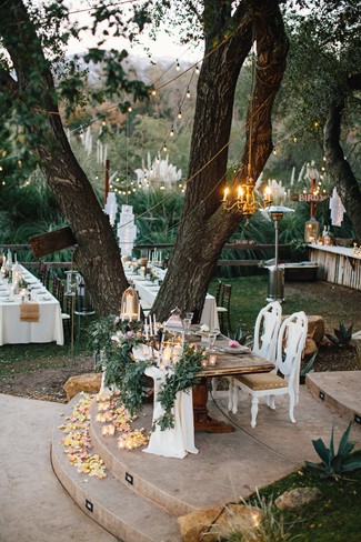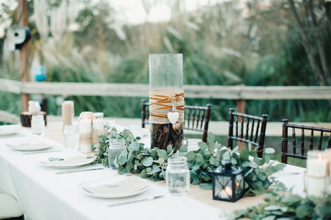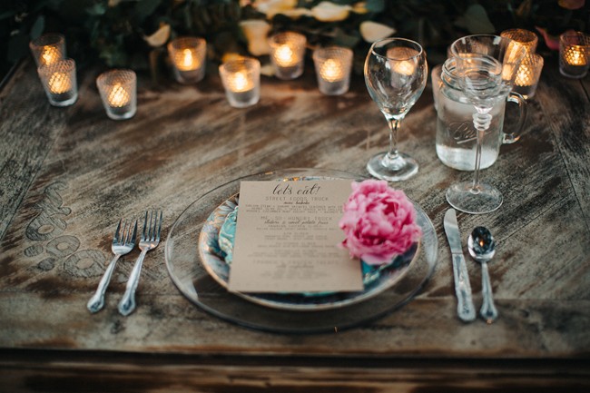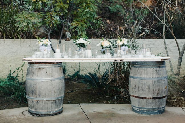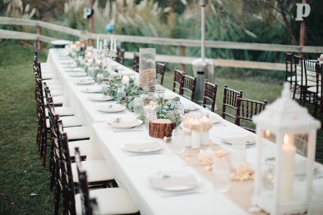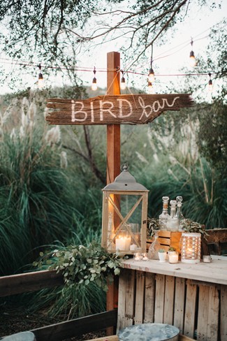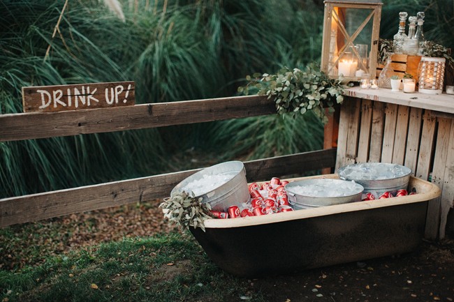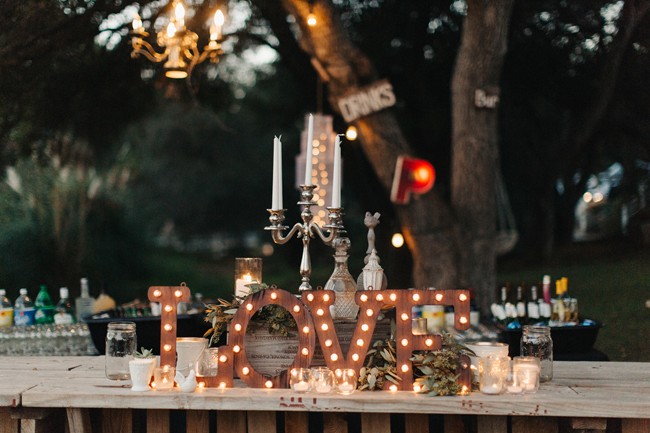 “Guests were seated at long king tables arranged in a starburst pattern around the dance floor. The venue’s reclaimed pallet bar featured lush greenery and bird cages and all drinks were served in Mason jars. Water bottles and vintage sodas were served on ice in antique bath tubs for guests to help themselves. Reclaimed wood signs made by the bride of barn wood from the couple’s Tennessee ranch were placed around the reception area to direct guests, and antique letter P’s collected by the bride’s family were scattered about to celebrate the couples new last name, Petersen. The men enjoyed cigars, whiskey and moonshine at the cigar bar which was set up on an enormous boulder. Guests roasted marshmallows and made s’mores by the bonfire and served themselves from the three food trucks that showed up during cocktail hour. Having the guests inside the barn for cocktail hour allowed for an element of surprise when the barn doors were opened and the entire reception area was illuminated and the food trucks had arrived and we ready to serve. The cake table was an antique dresser that was sanded and refinished, as were the bride and groom’s chairs.”