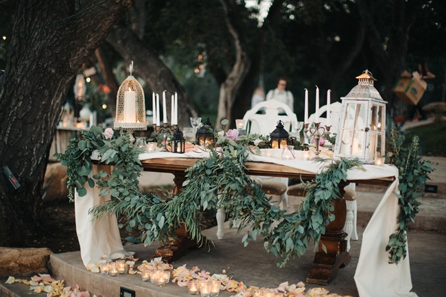 “The sweetheart table was situated on the steps leading to the dance floor so the newlyweds had a view of their entire reception during dinner.”