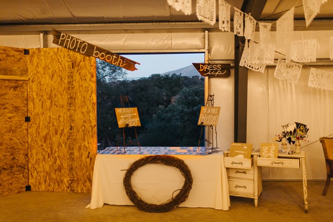 “Cocktail hour was held in the barn with fresh Mexican street tacos made to order on a huge grill. Guests mingled under hundreds of Mexican flags hung from the rafters and took pictures in a pseudo-photo booth. The photo area was as 3-ply wooden structure made by the bride’s father, and a photographer was present to take professional images of the guests as they held up antique marquis letters and costume props. The idea was to allow large groups to fit into a single photograph, something that a traditional booth would not have allowed.”