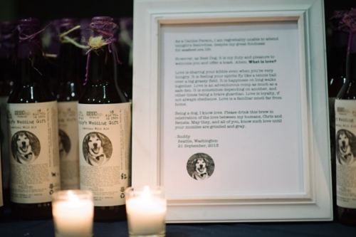 Our dog, Ruddy, plays a special role in our lives and unfortunately wasn’t able to attend the ceremony.  We worked with our favorite local brewery, Epic Ales, to prepare a custom brew and label: Ruddy Brew, which included a special wedding toast written from Rudy on the label: