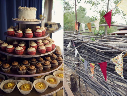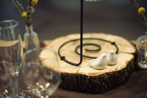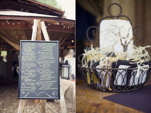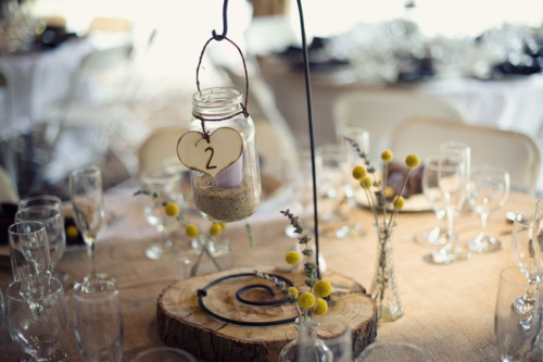 For centerpieces, Chris and Alyssa had small shepherd’s hooks holding up mason jars filled with sand and votive candles. Little hearts with the table numbers were tied on. Love that idea, especially paired with the wood round, the burlap tablecloth, and the little bottles filled with flowers!